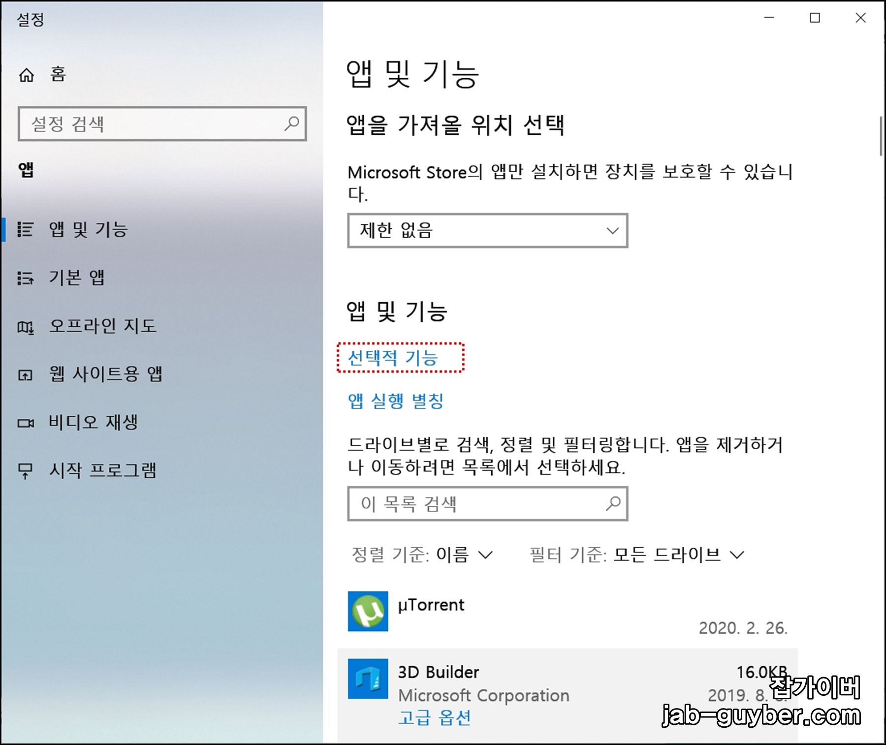 - 앱 및 기능 또는 설정으로 이동