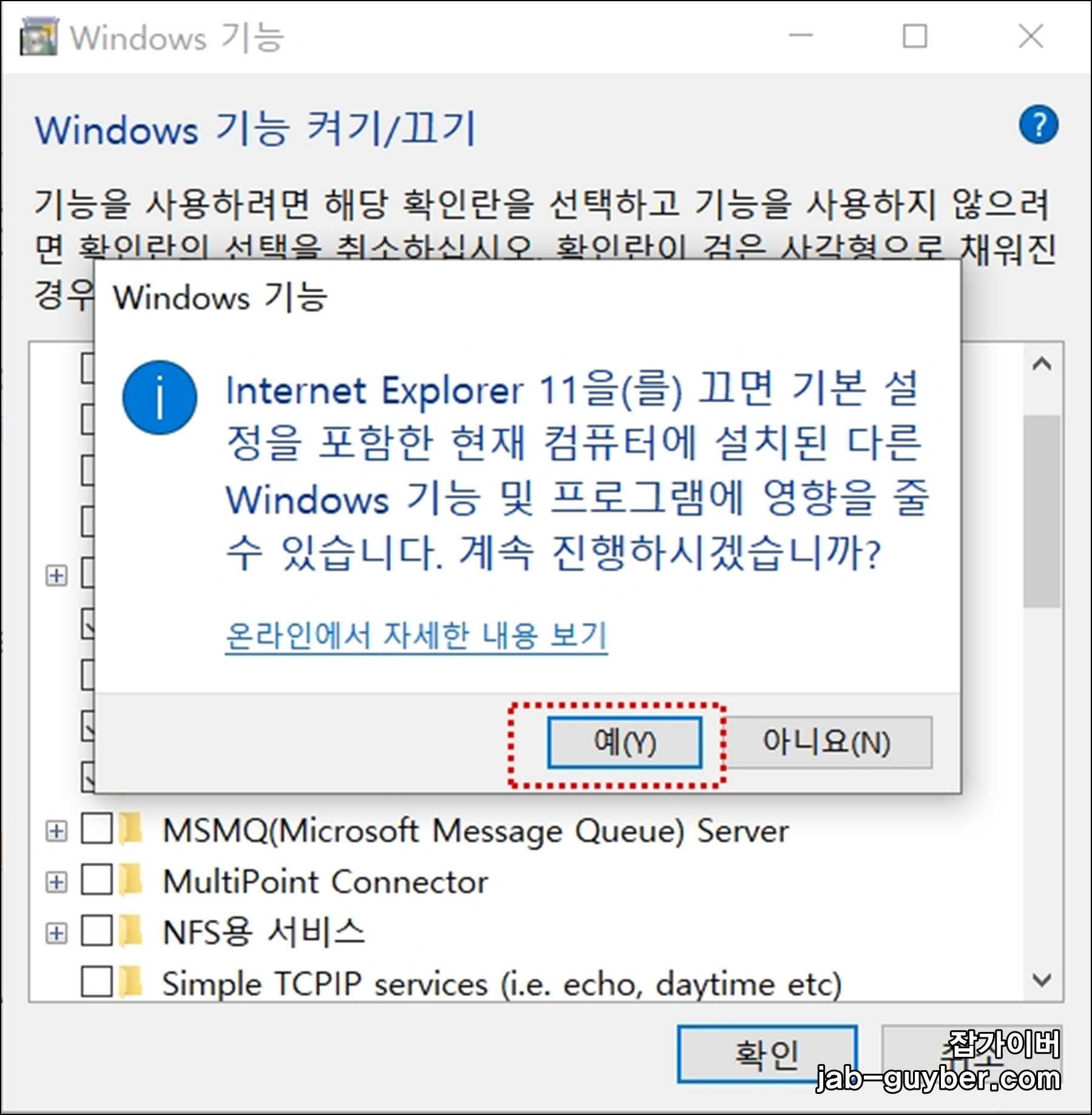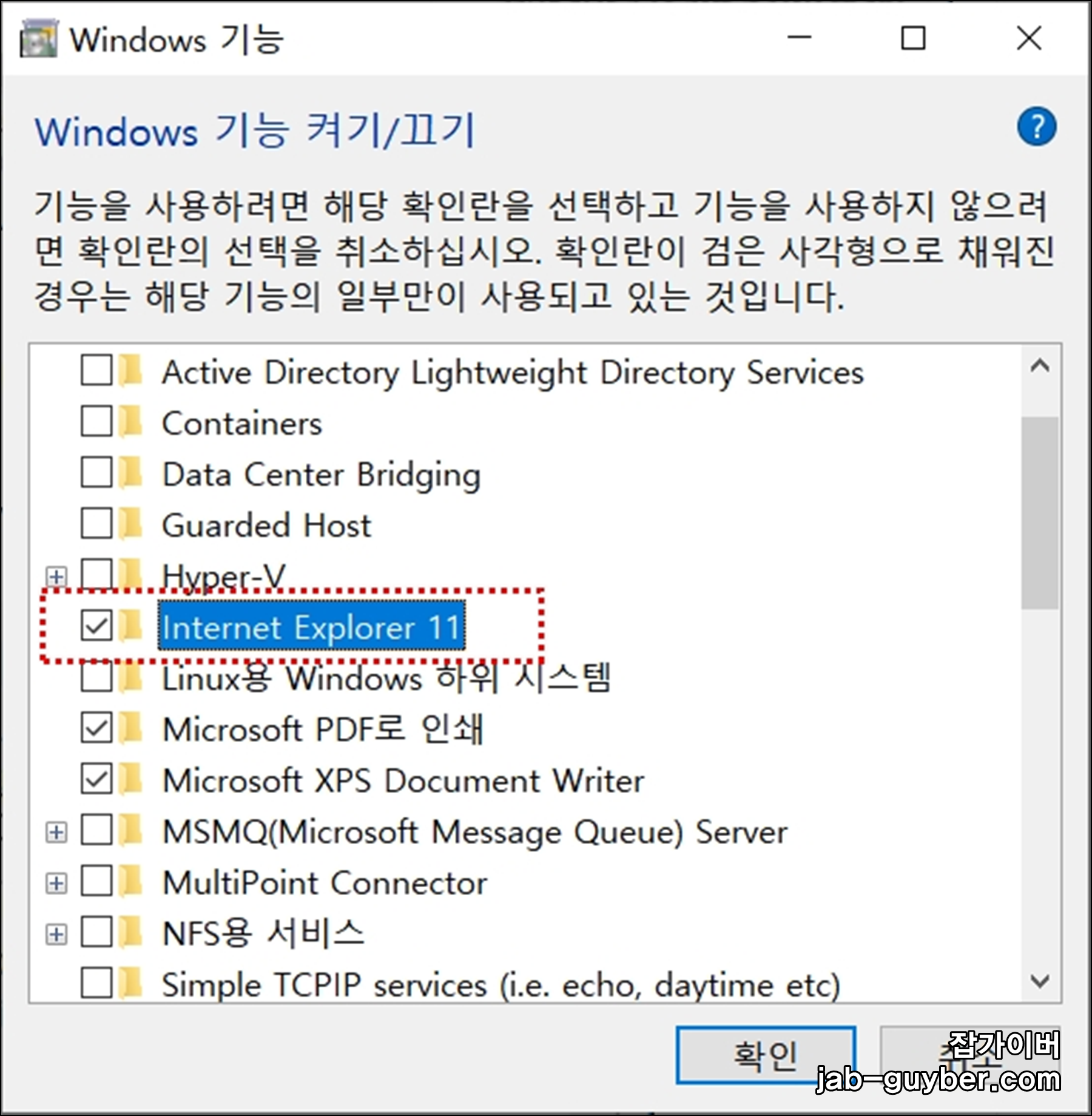 Windows 기능에서 Internet Explorer 11 체크 해제