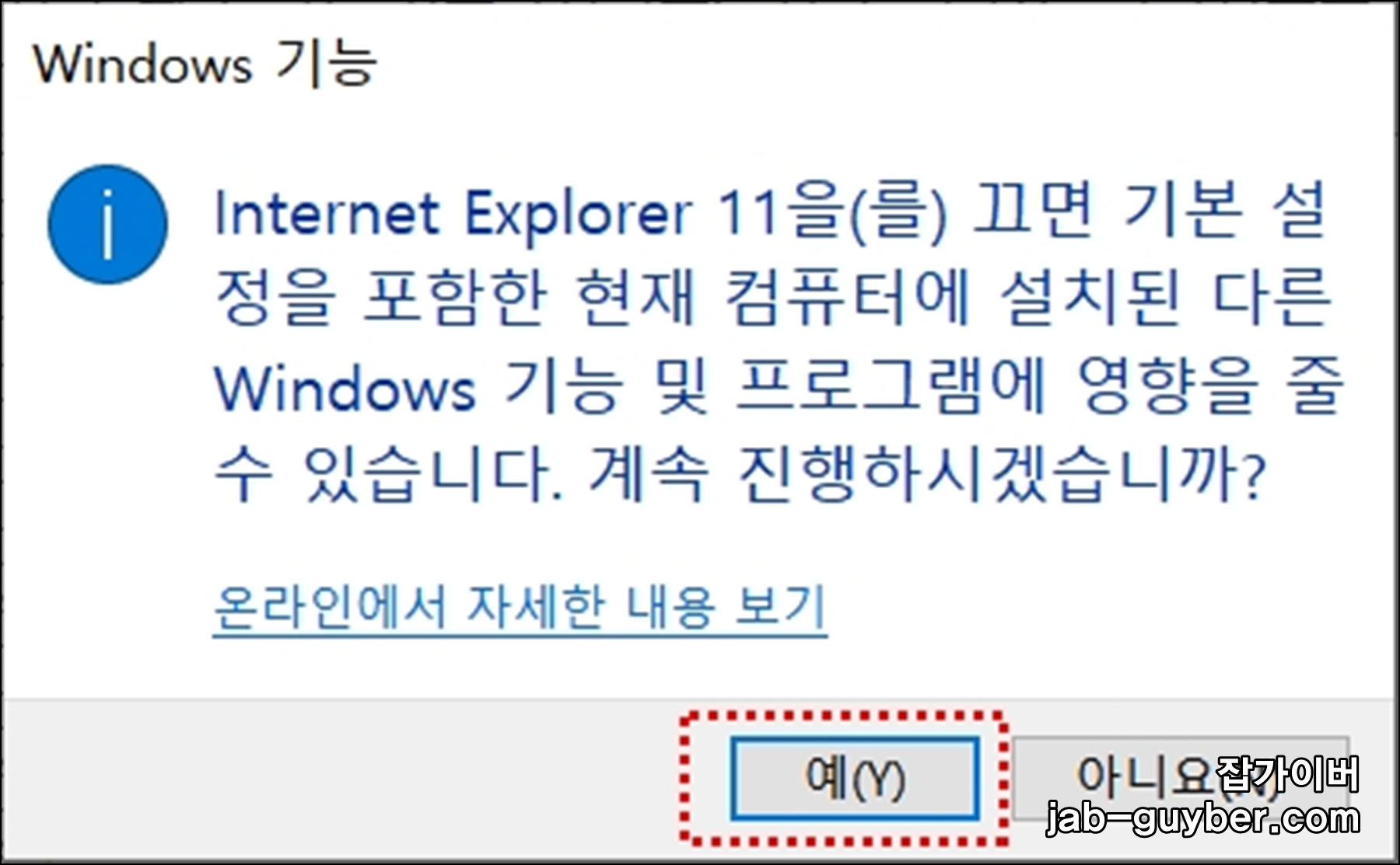 체크를 해제하면 경고가 한 번 뜹니다. 내용이 좀 무섭게 나와도, IE만 안 쓰는 환경이라면 대부분 그대로 진행해도 괜찮습니다. "예"를 눌러 적용하세요.