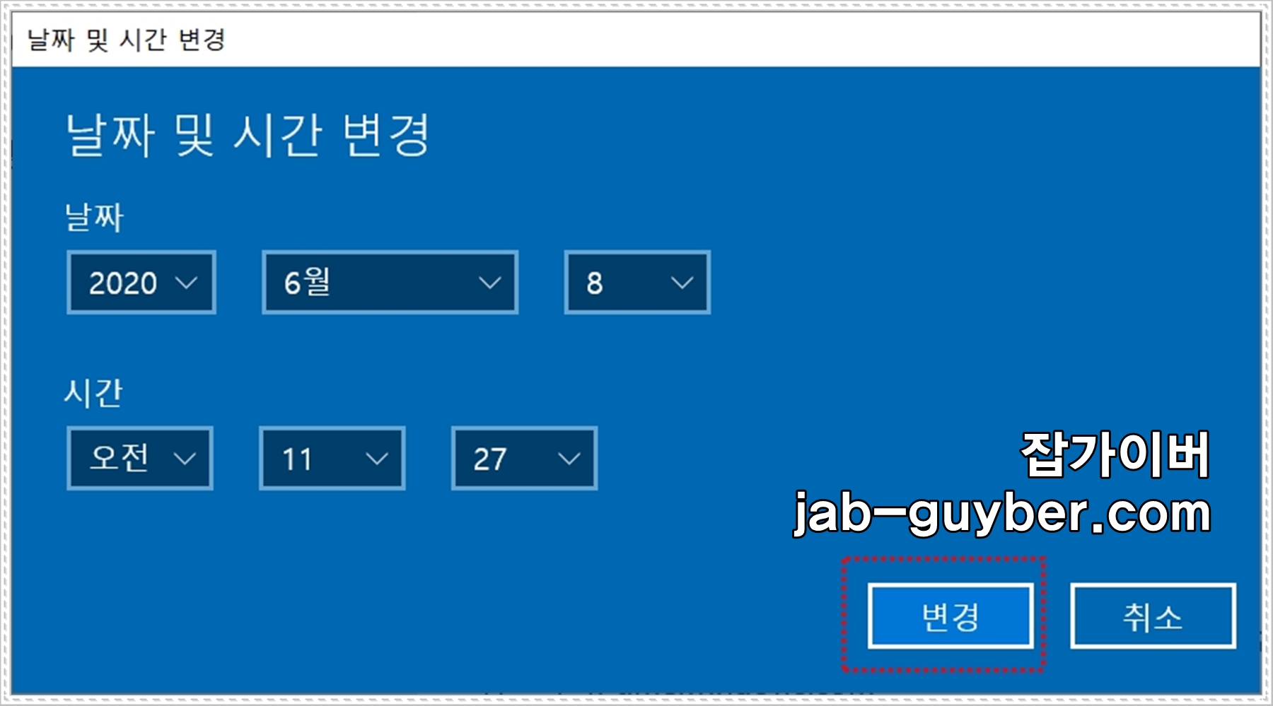 수동으로 날짜 및 시간 설정 -> 변경을 선택합니다.