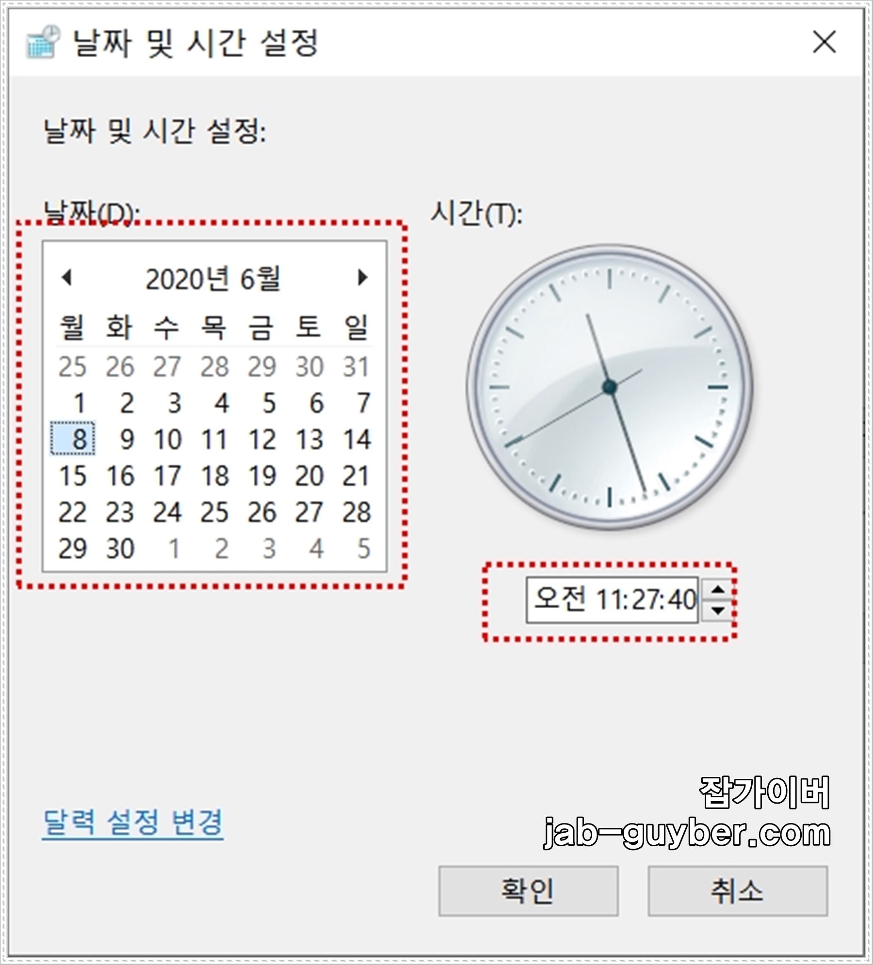 원하는 날짜와 시간을 임의로 입력 후 "확인"을 눌러주면 정상적으로 윈도우10 시간 날짜가 변경되었습니다.