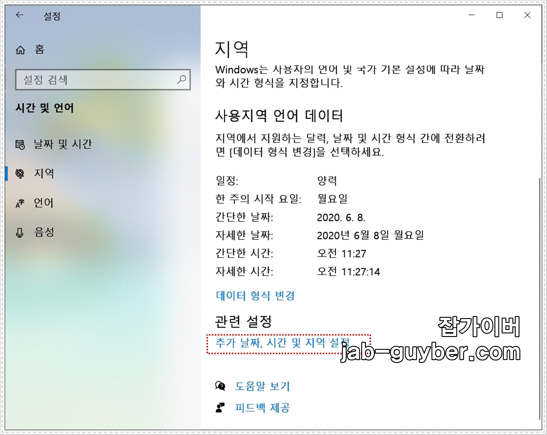 - 관련 설정 -> 날짜 시간 및 사용지역 언어 선택