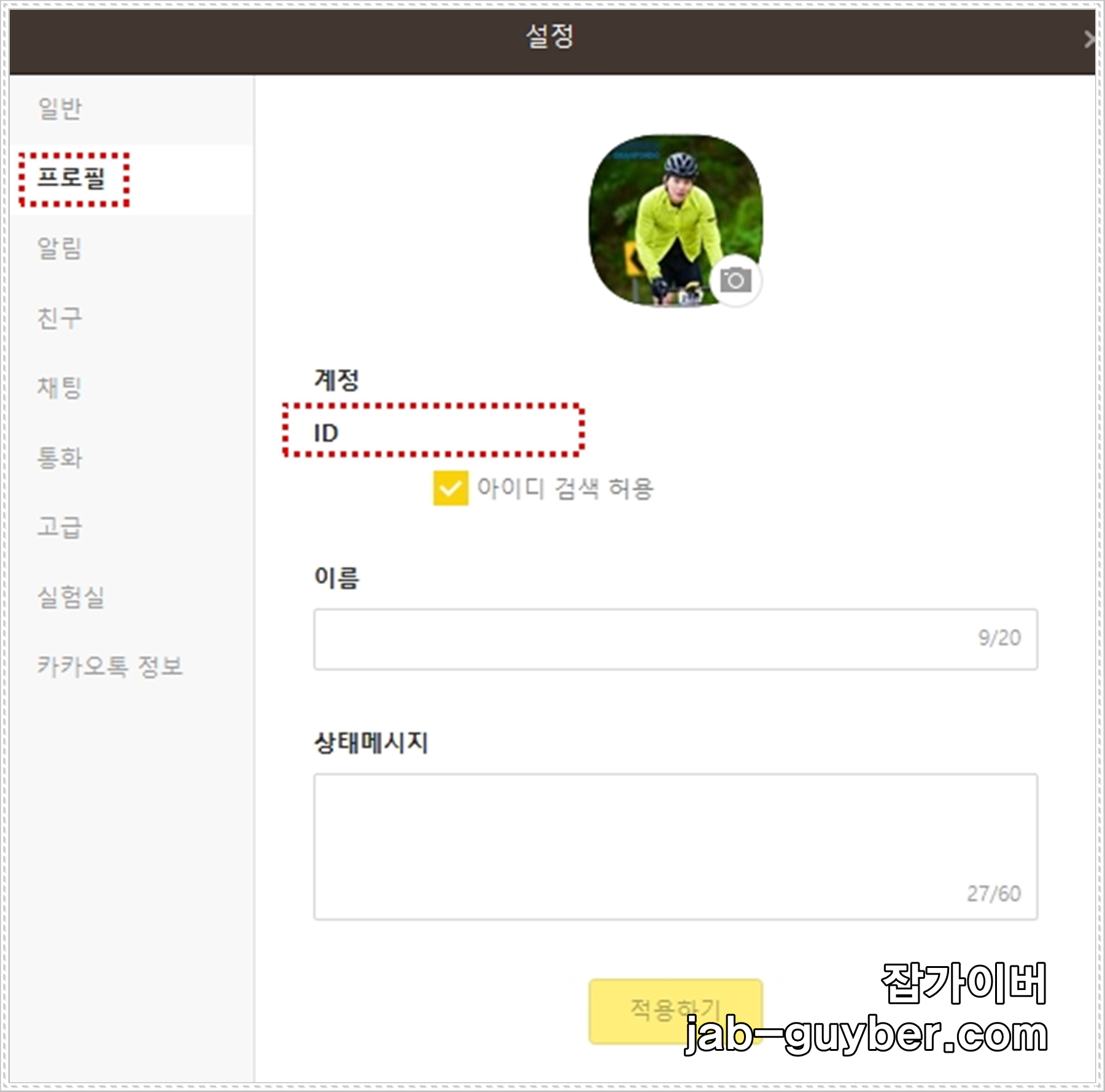 프로필 항목을 선택하면 계정 아래에 ID가 존재합니다.