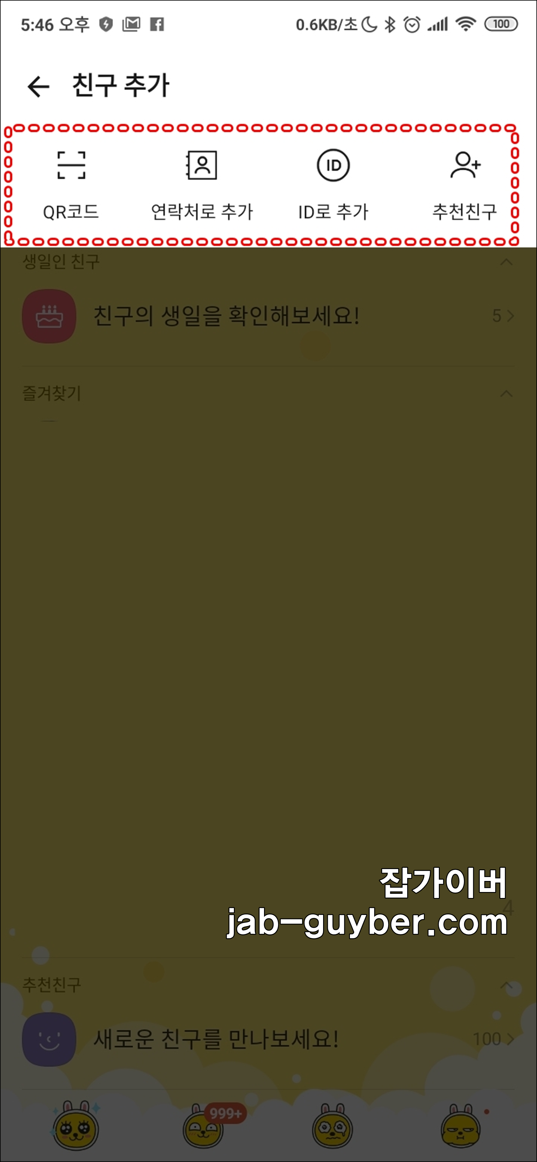 친구 목록에서+ 아이콘을 선택하면 4가지의 친구 추가 종류가 존재합니다.