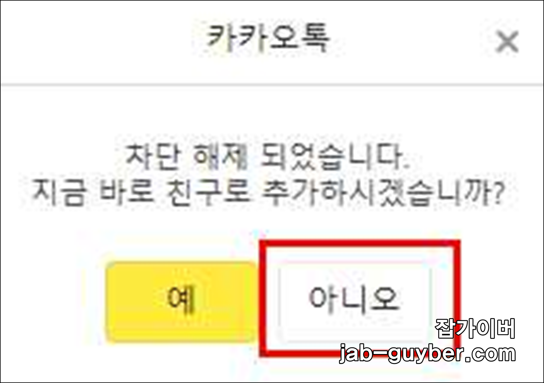 여기서 차단해제버튼을 누른다면 "지금 바로 친구로 추가하시겠습니까?"라는 물음에 "아니오"를 클릭합니다.