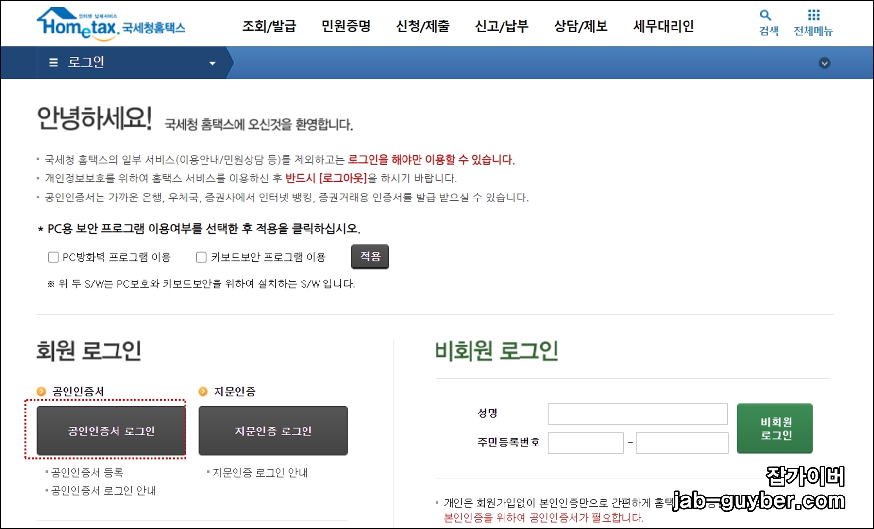 기본적으로 공인인증서를 이용한 자신의 정보가 담긴 계정으로 로그인을 진행합니다.