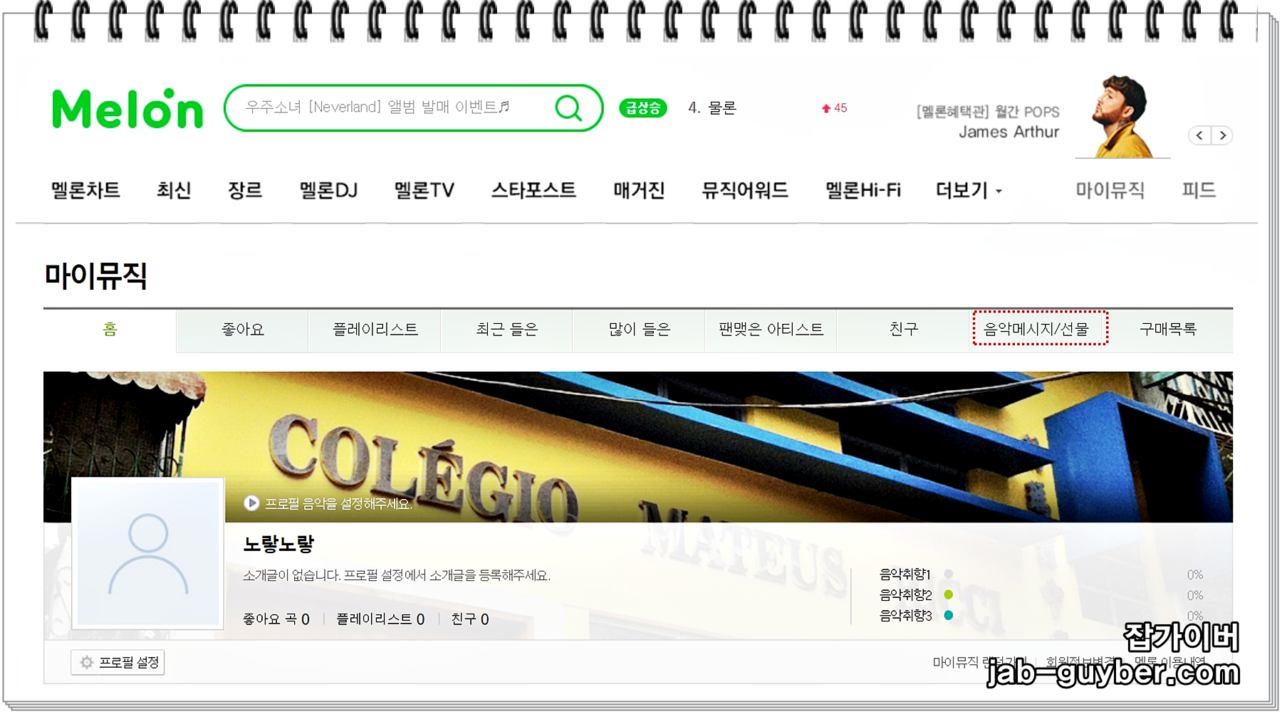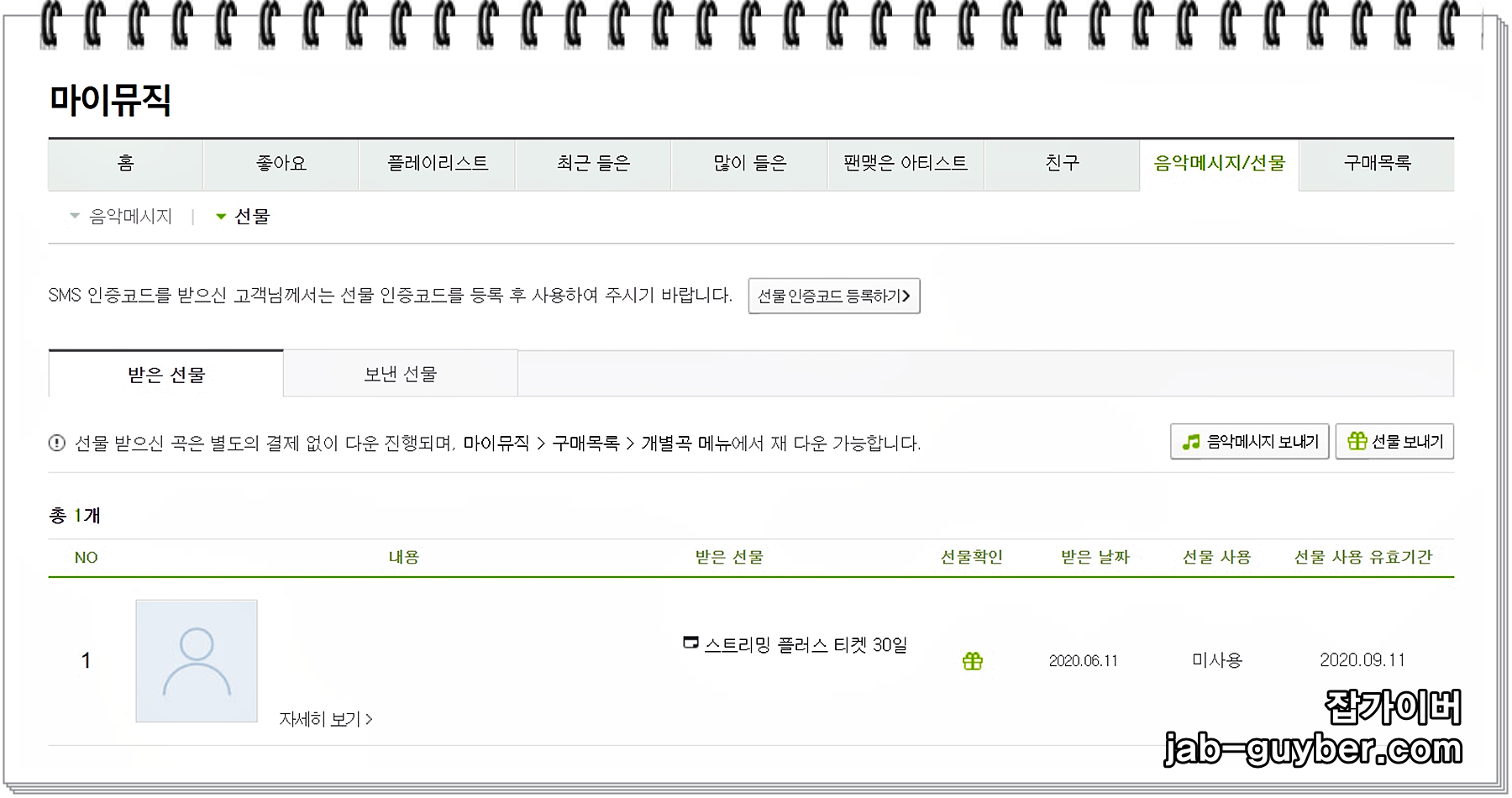 음악 메시지 / 선물 탭을 선택합니다.