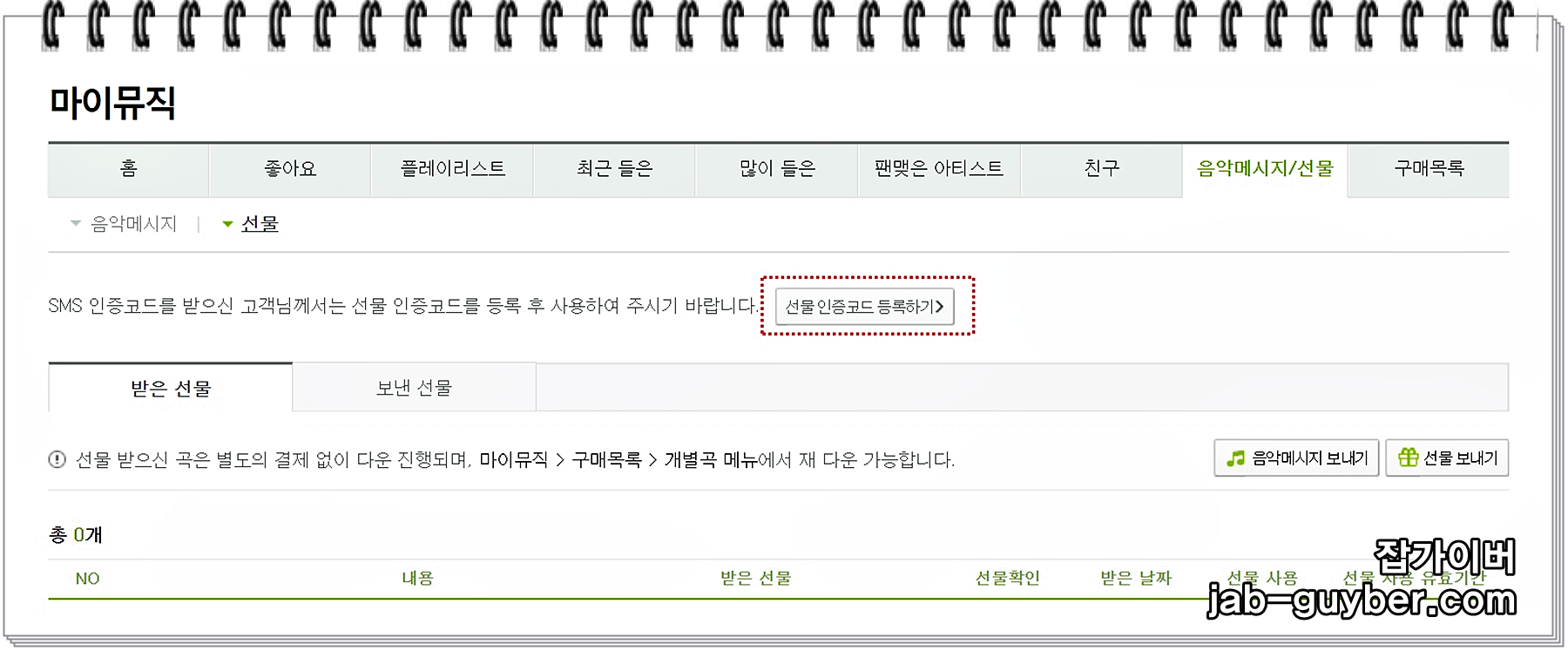 음악 메시지 / 선물 탭을 선택합니다.