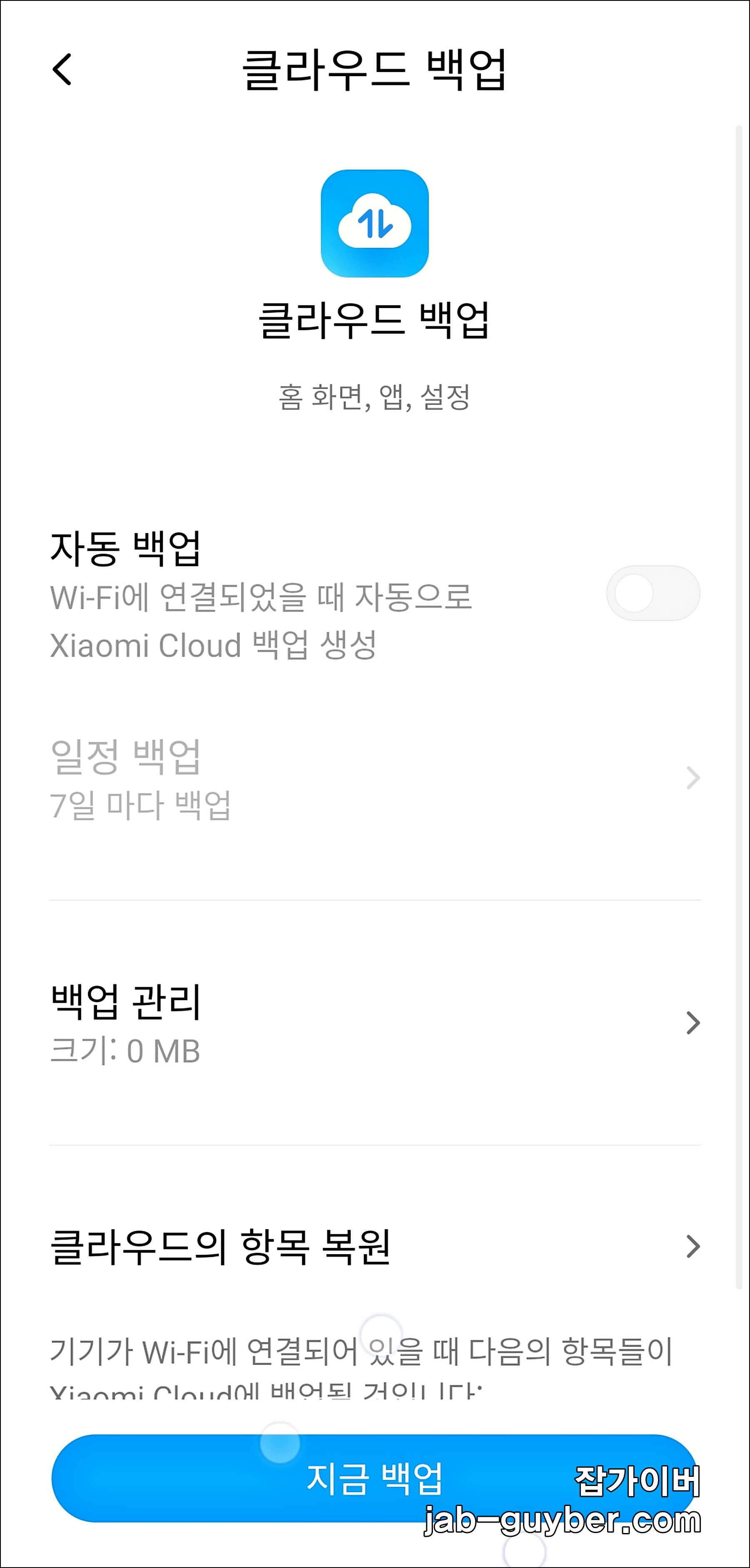 샤오미 계정 동기화를 통해 샤오미 클라우드로 백업되는 항목을 데이터 상태일 때와 와이파이 상태일때 자동 백업 선택할 수 있습니다.