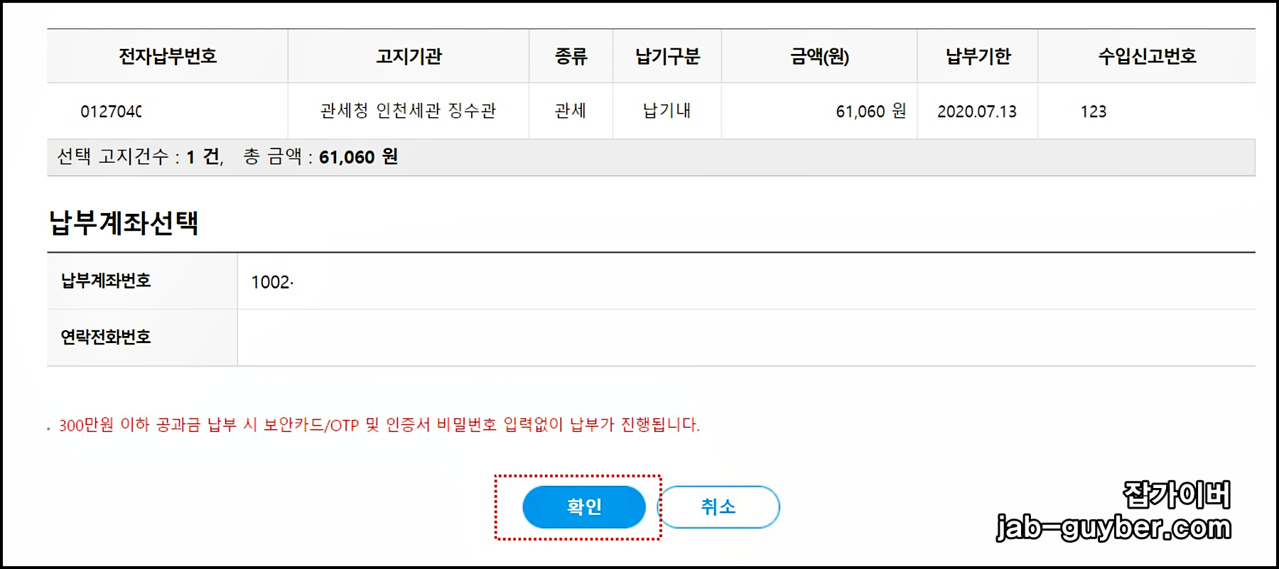 납부 금액이 확인되면 출금 계좌를 선택하고 비밀번호 또는 은행이 요구하는 인증 절차를 진행하면 됩니다.