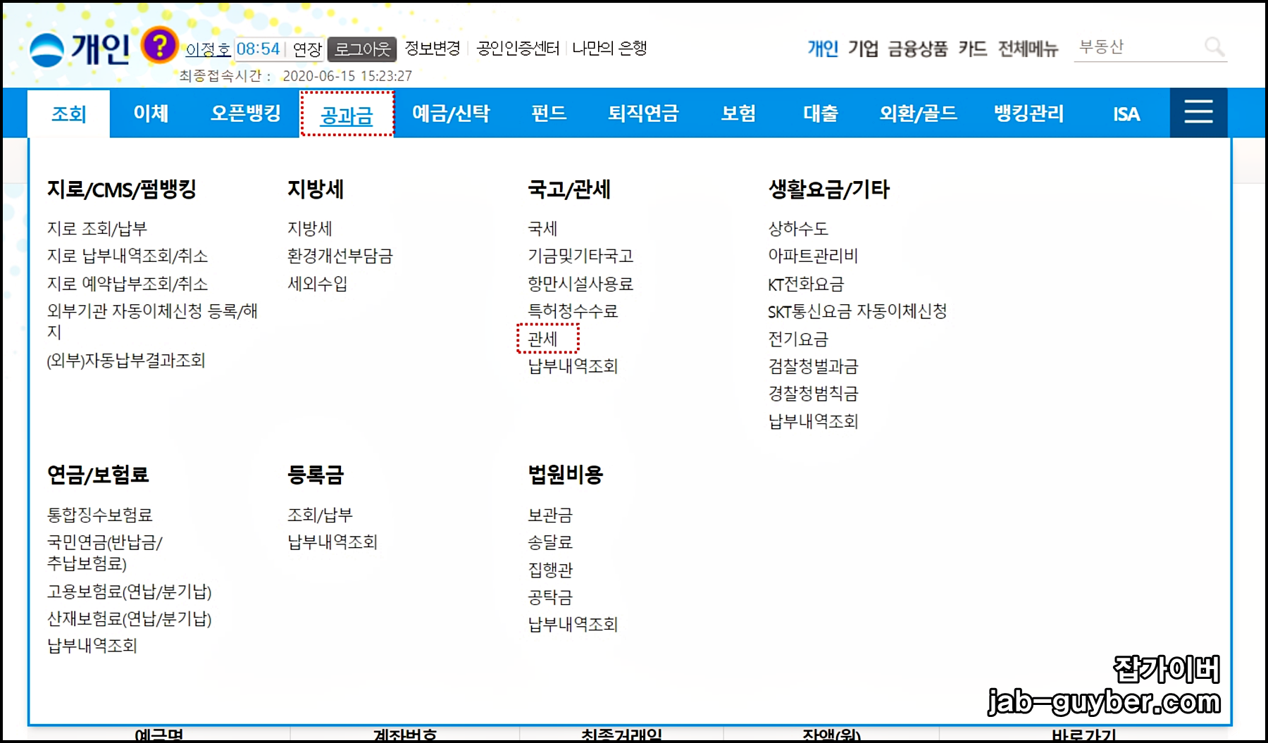 - 세금/공과금 메뉴로 이동한 뒤 국고/관세 안의 관세 메뉴를 선택합니다.