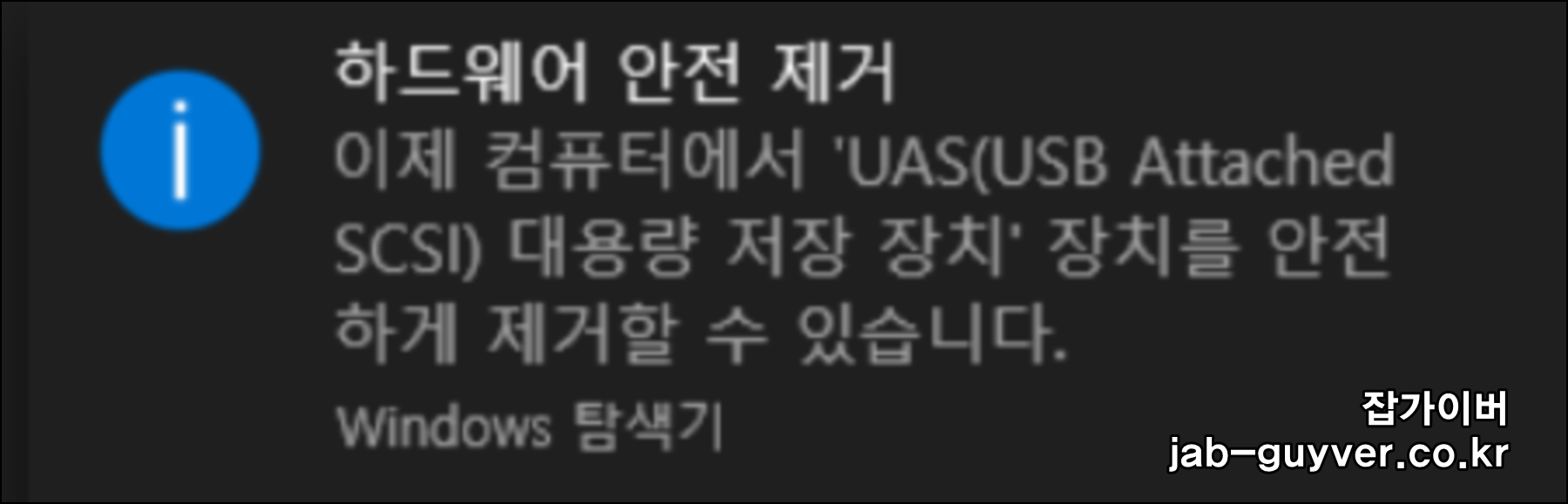 | 이제 컴퓨터에서 "UAS(USB Attached SCSI)대용량 저장 장치"장치를 안전하게 제거할 수 있습니다. |