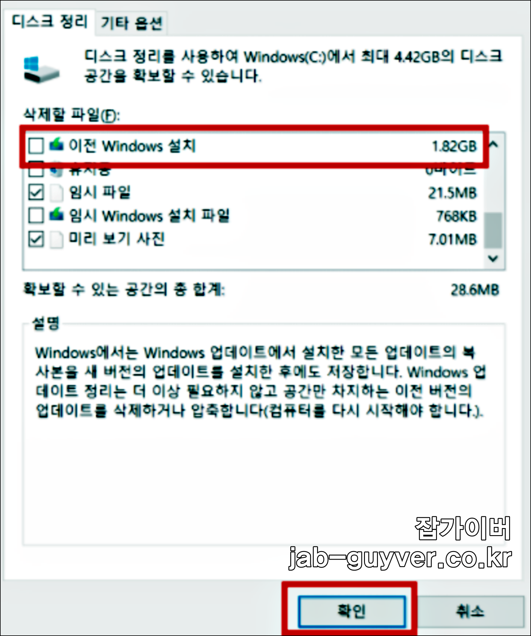 이런경우 기존 윈도우 삭제해서 업데이트된 파일을 지우는 방법으로 하드디스크 용량을 확보할 수 있습니다.
