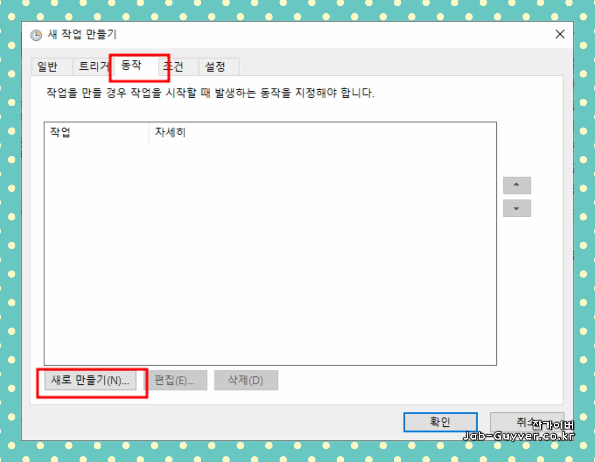 이름을 알아보기 쉽게 적고, 트리거에서 실행 주기를 정한 다음, 동작에서 실행 파일을 지정하면 됩니다.