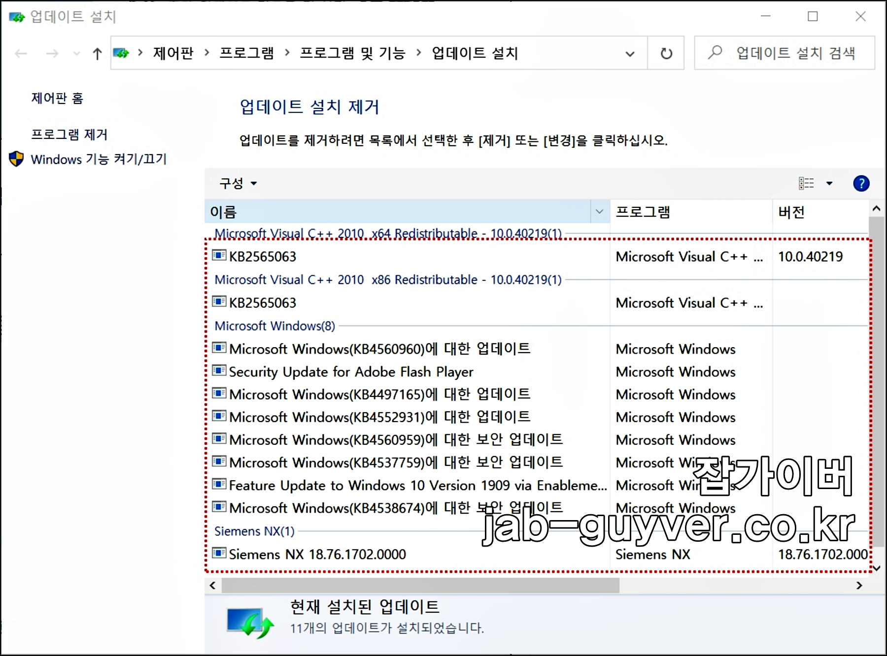업데이트 제거를 선택하면 기존에 업데이트된 파일을 삭제할 수 있습니다.