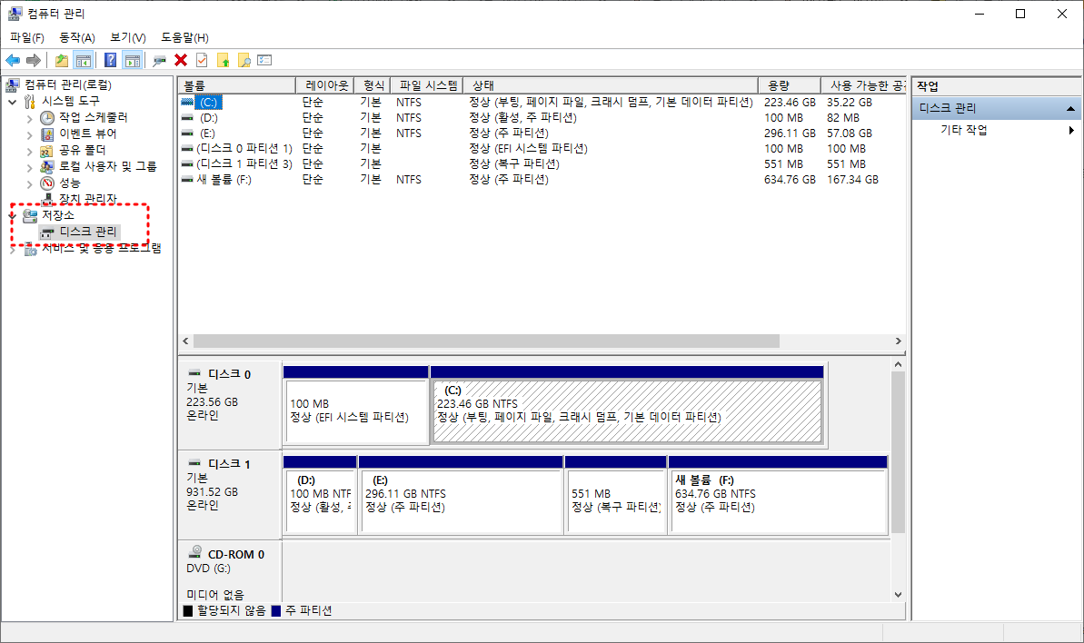 윈도우 장치 관리자에서 드라이버는 정상인데 파일 탐색기에서는 안 보일 경우, 디스크 관리(디스크 관리 도구)에서 드라이브 문자가 할당되지 않았는지 확인해야 합니다.
