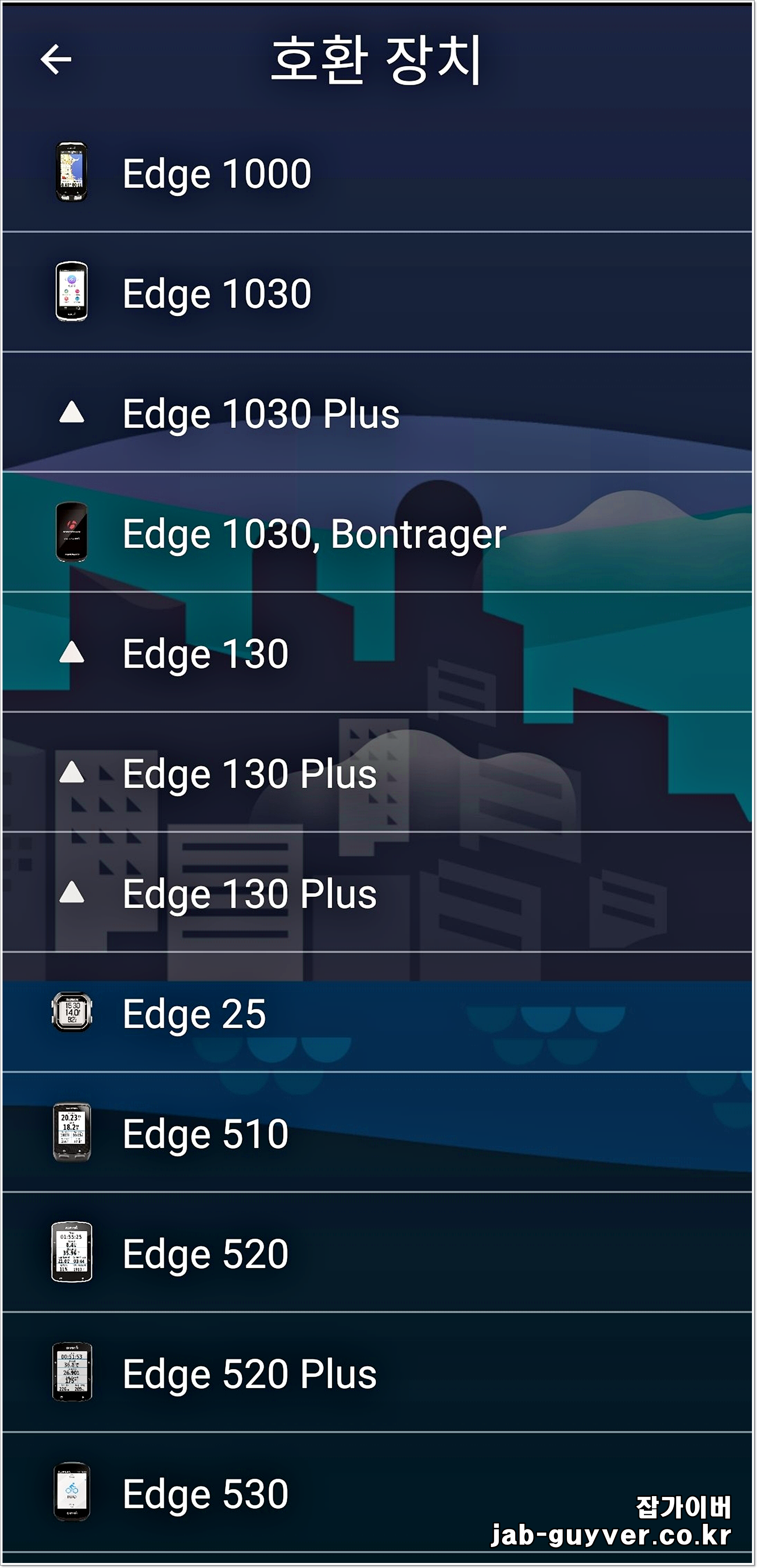 엣지 130 / 엣지 130 플러스 / 엣지 500 / 엣지 510 / 엣지 520 / 엣지 530 / 엣지 530 플러스 / 엣지 540 / 엣지 540 솔라 / 엣지 800 / 엣지 810 / 엣지 820 / 엣지 830 / 엣지 830 플러스 / 엣지 840 / 엣지 840 솔라 / 엣지 1030 / 엣지 1030 플러스 / 엣지 1040 솔라 / 엣지 1050 / 엣지 익스플로어 2 / 엣지 MTB |