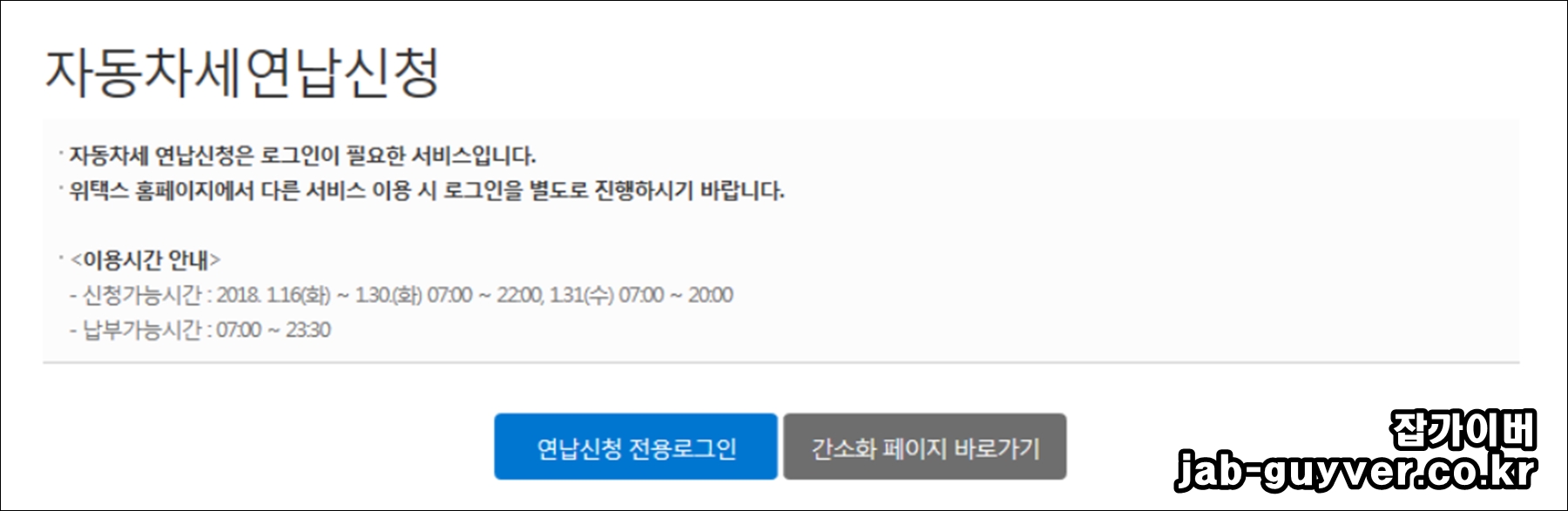 위택스 사이트로 접속하면 자동차세 납부기간에는 안내 페이지가 표시됩니다. 연납을 원하면 자동차세 연납신청 메뉴에서 조회를 먼저 합니다.