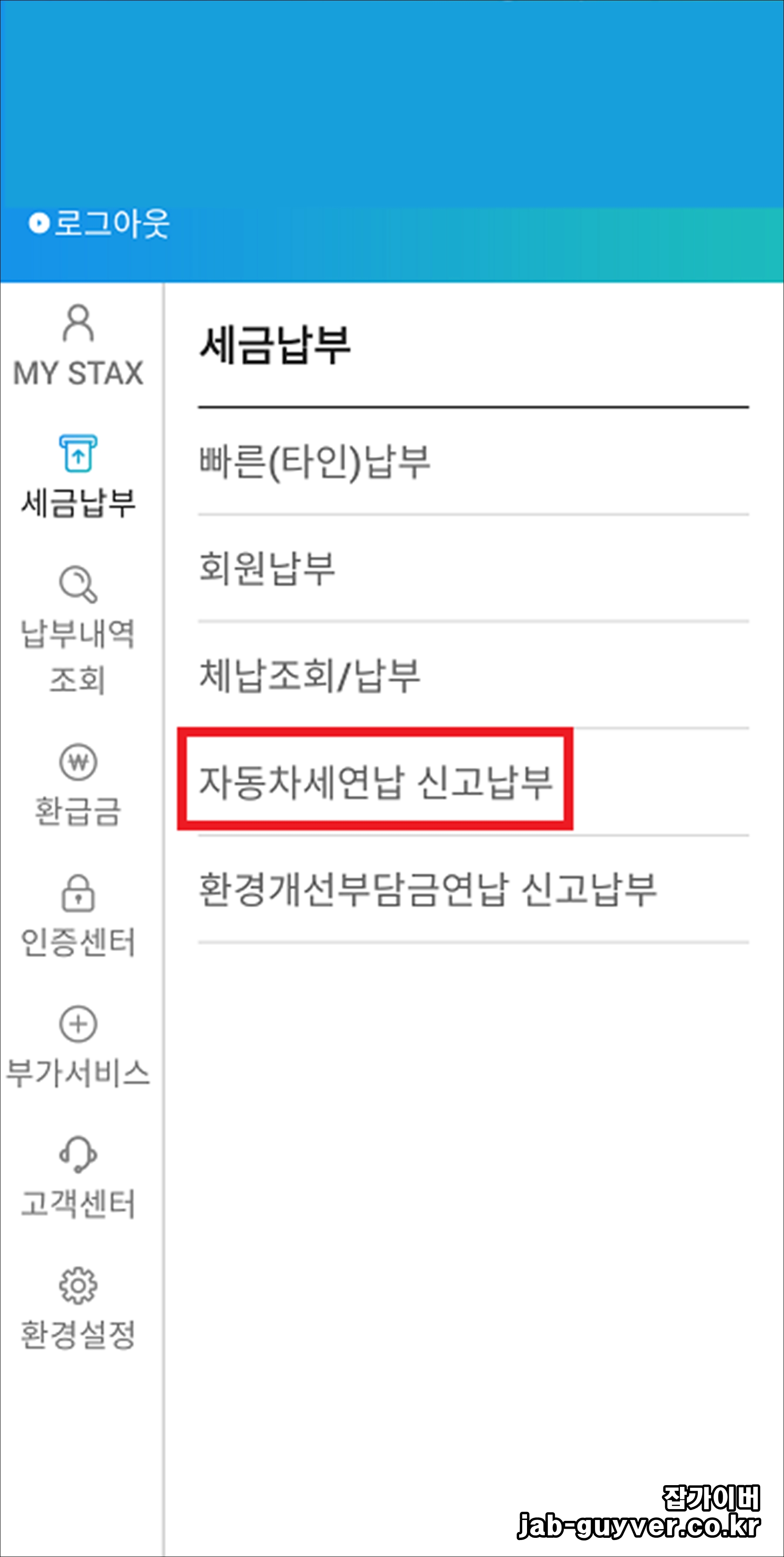 - 세금납부 -> 자동차세 연납 신고납부 선택합니다.