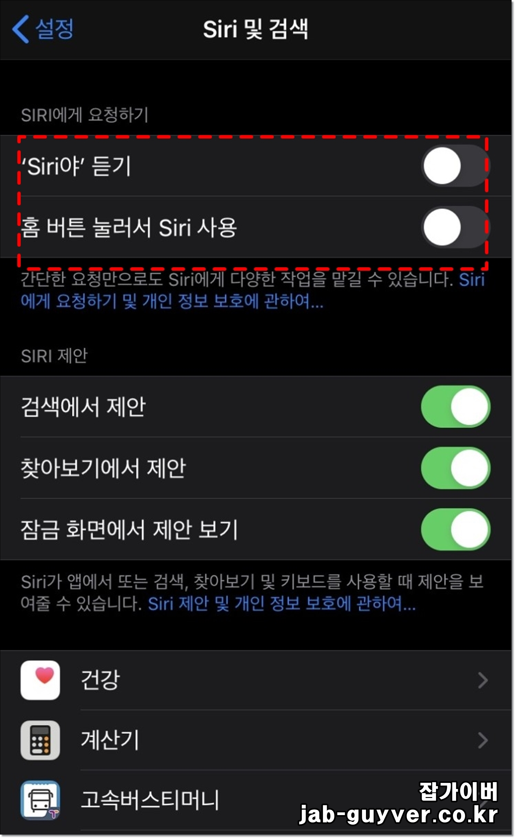 여기에서 시리를 부르는 방식과 버튼 사용 여부, 잠금 화면 사용 여부 등 여러 항목을 켜고 끌 수 있습니다.