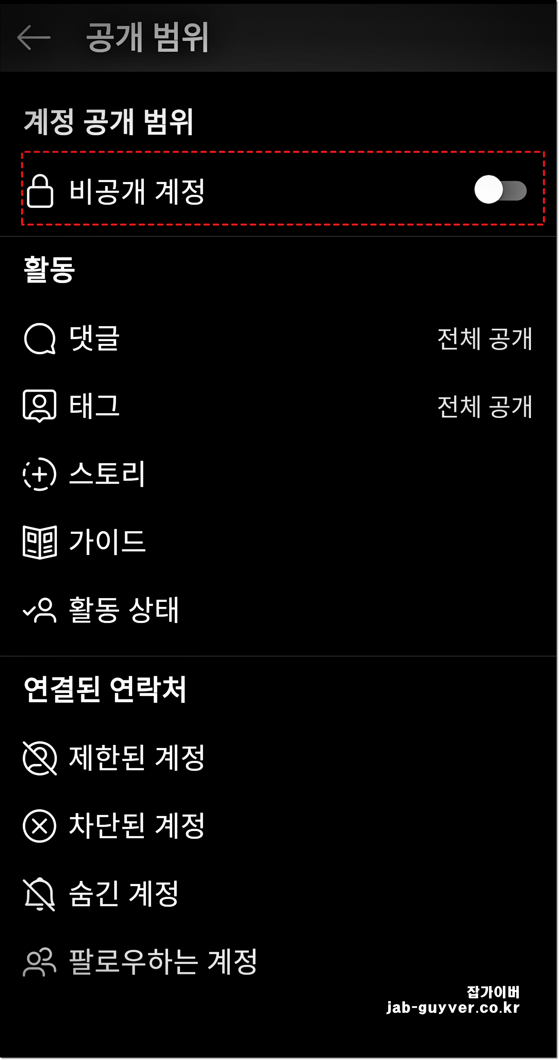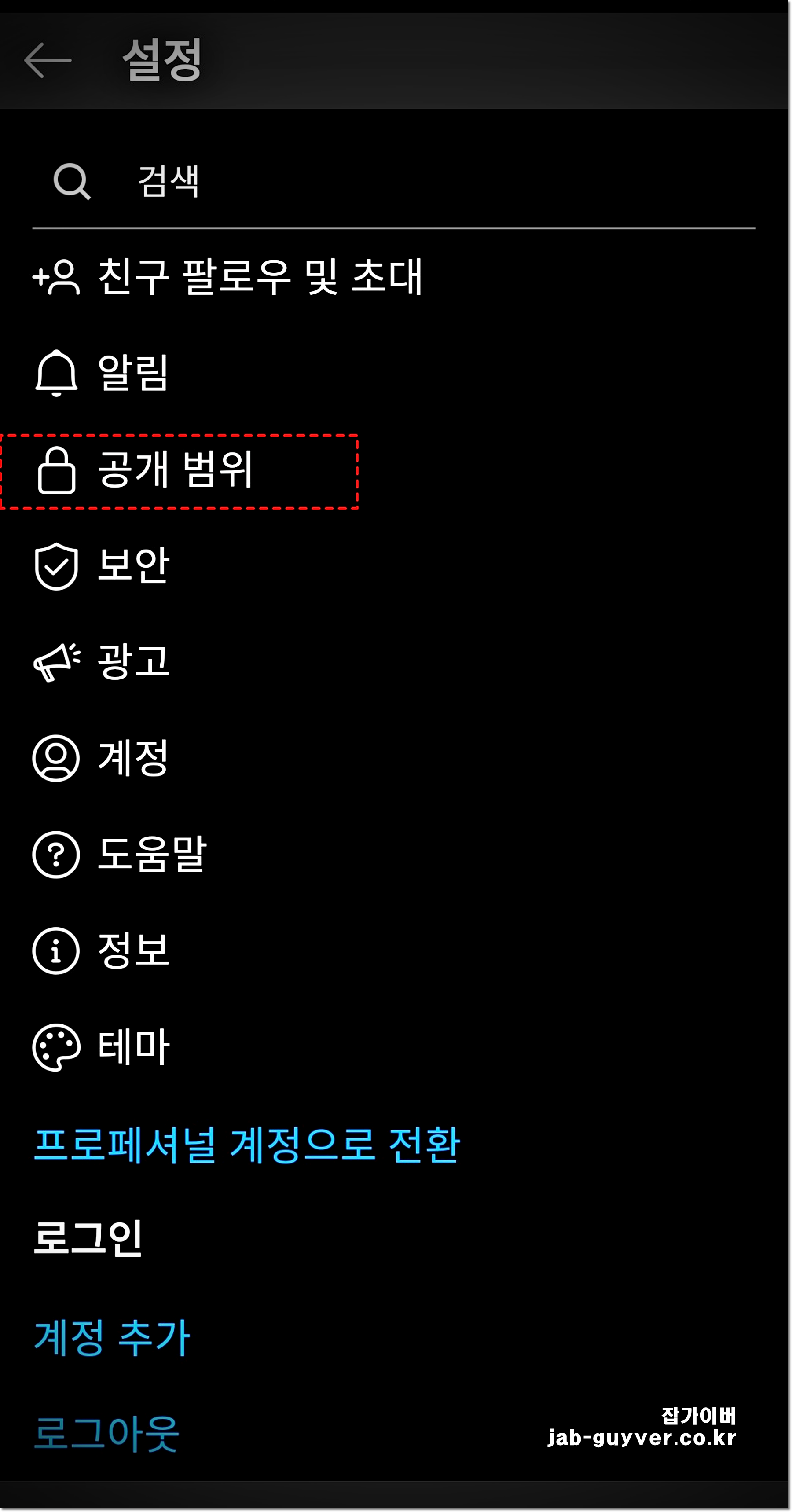 인스타 설정에서 "공개범위"를 선택하면 계정의 공개범위를 설정할 수 있습니다.