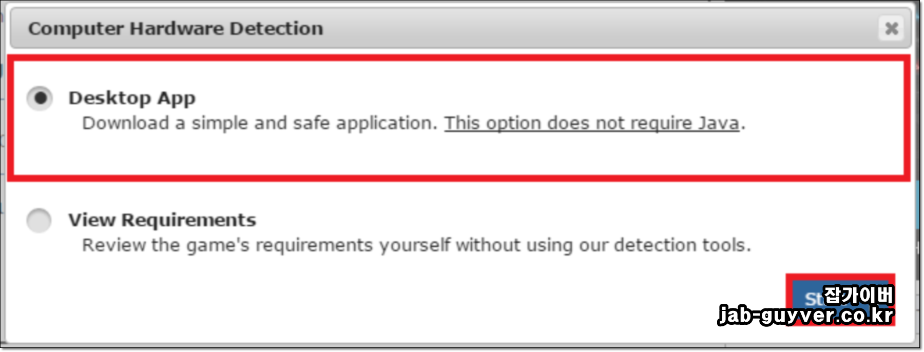 검색 후 Can you run it을 선택합니다. Desktop app을 선택 후 Start를 눌러주면 사양테스트를 위한 파일이 다운로드됩니다. 이를 실행시켜줍니다.