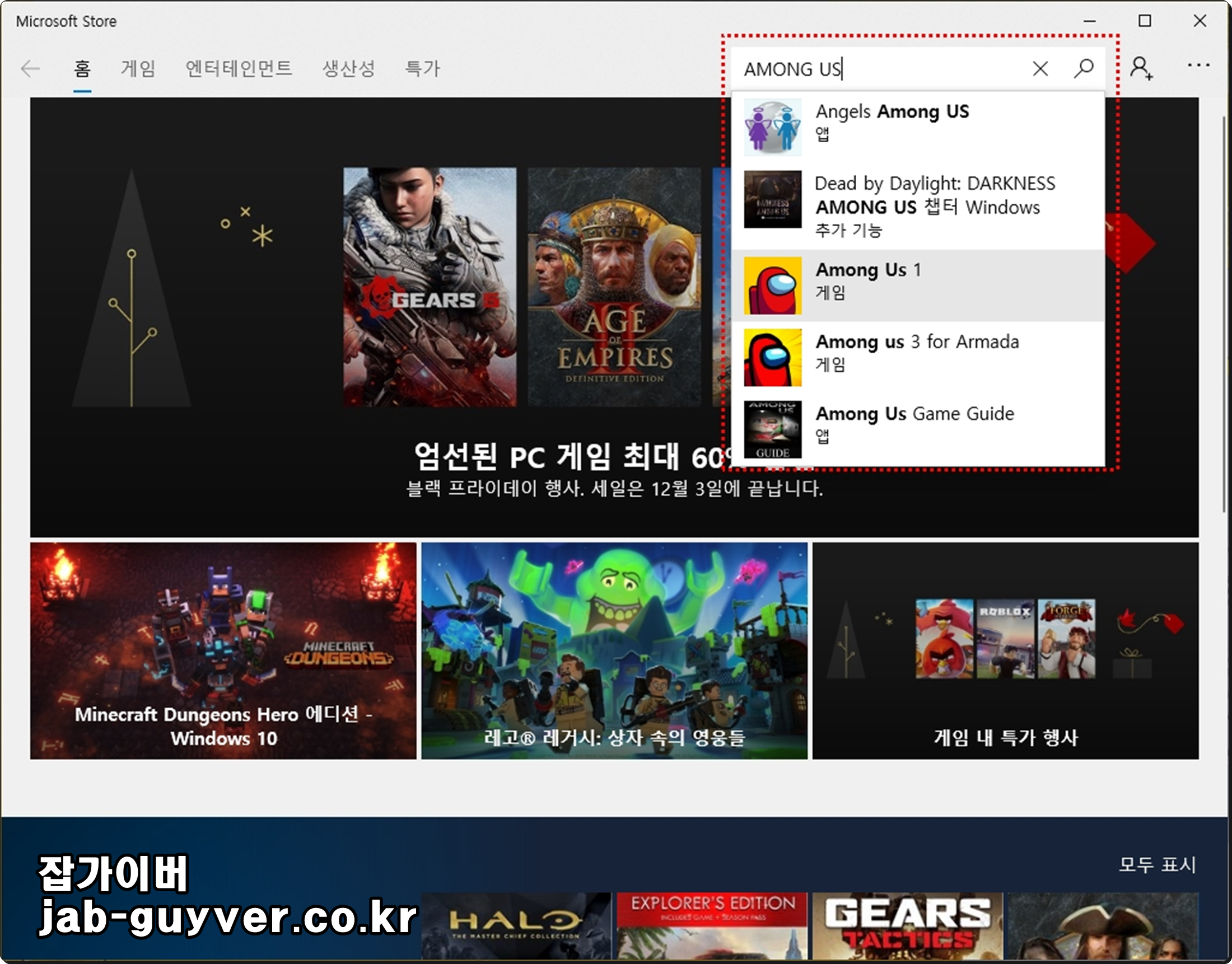 윈도우10, 11에서 Microsoft Store를 이용하는 경우에는 시작 메뉴나 작업표시줄에서 스토어 아이콘을 실행하고, 우측 상단 검색창에 Among Us를 입력해서 검색하면 됩니다. 예전 글에서 적어둔 것처럼 여러 모바일 게임도 함께 설치할 수 있어서 간단히 관리하기 좋아요.