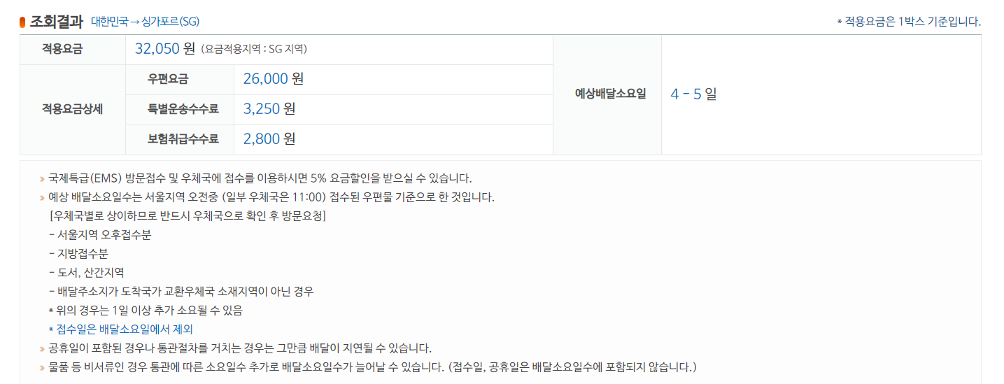 조회 화면에서 보통 우편요금, 특별운송수수료, 보험/부가 서비스, 예상 배달 소요일이 함께 뜨기 때문에, “대충 얼마나 나오냐”를 가장 빠르게 잡을 수 있습니다.