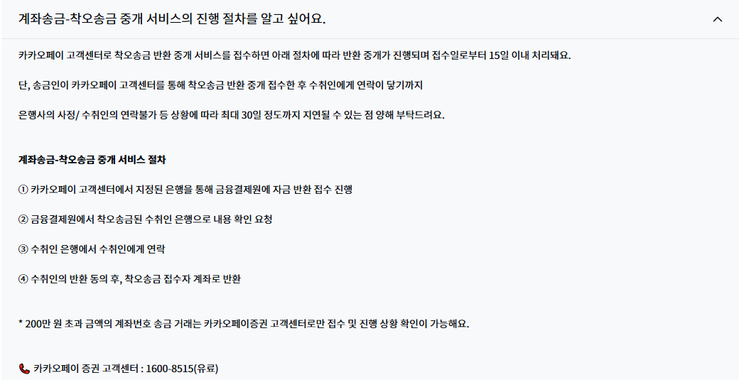 여기서 중요한 예외가 있으며 최대한도 200만 원 초과 계좌송금 거래는 카카오페이 고객센터 일반 경로보다 카카오페이증권 고객센터 1600-8515로 문의하라고 공식 안내가 따로 붙어 있습니다.