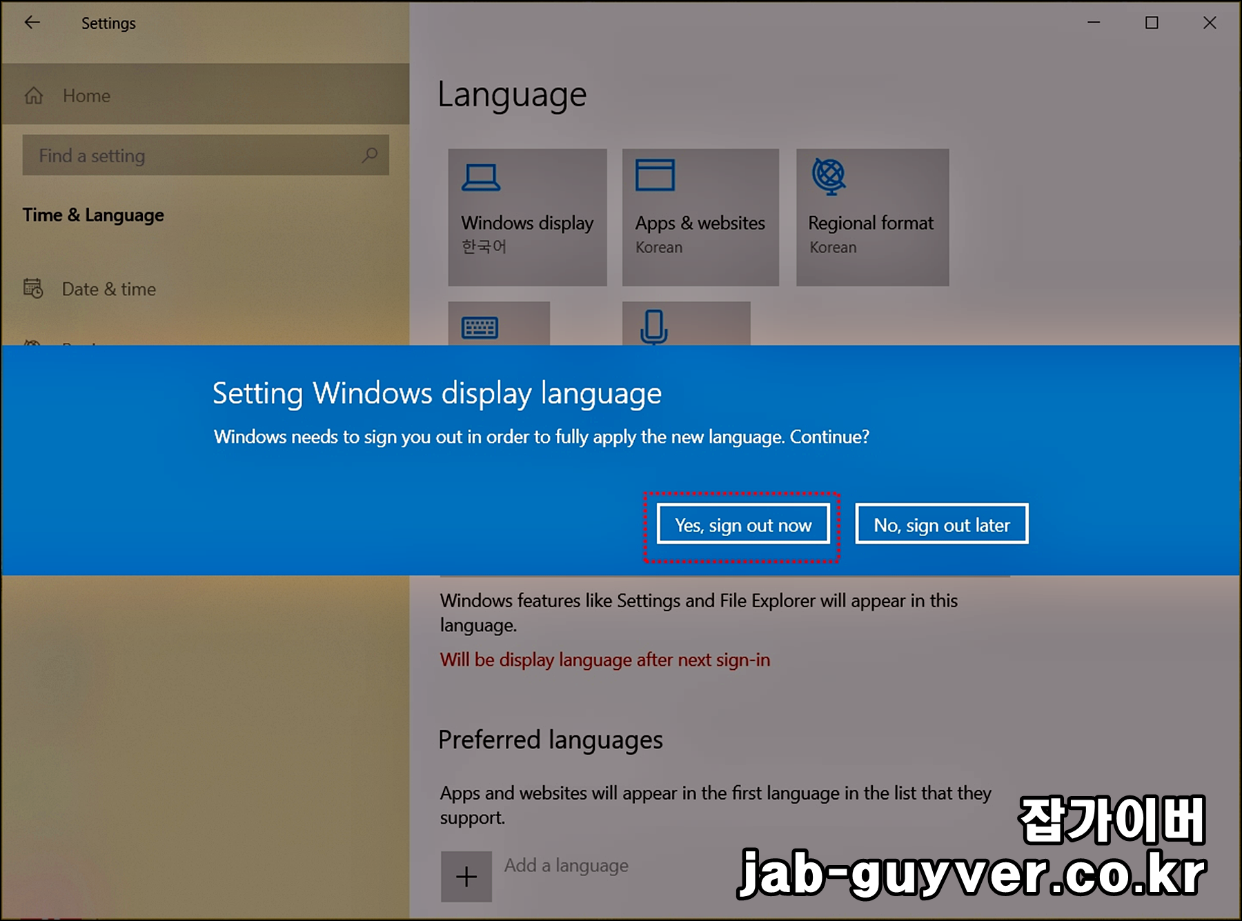 - 설정 > 시간 및 언어 > 언어 에서 "Windows 표시 언어"를 한국어로 반드시 선택