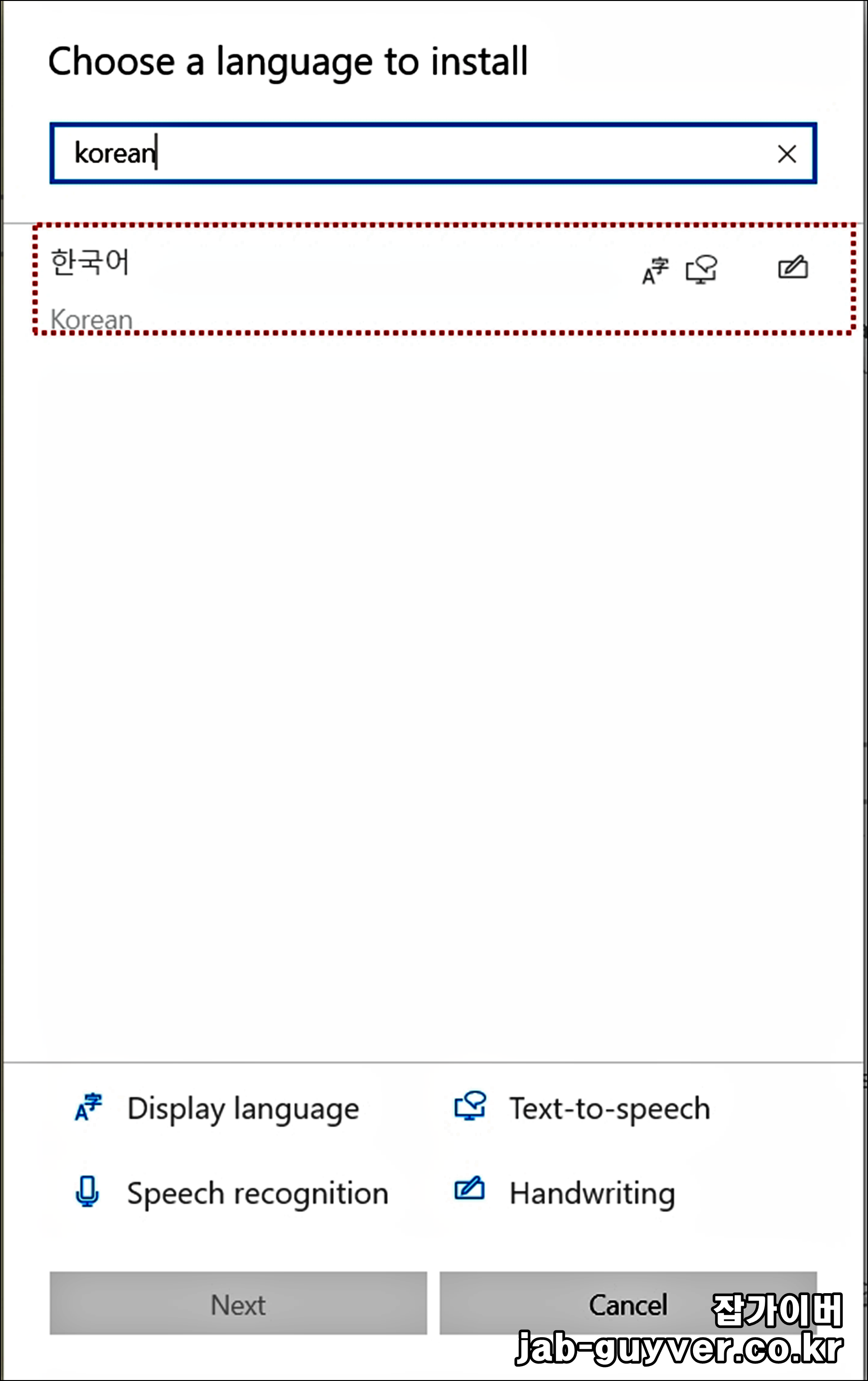 윈도우에서 제공하는 다양한 언어로서 한국어를 추가하고 싶다면 Korean을 선택해서 한글언어팩을 추가 설치합니다.