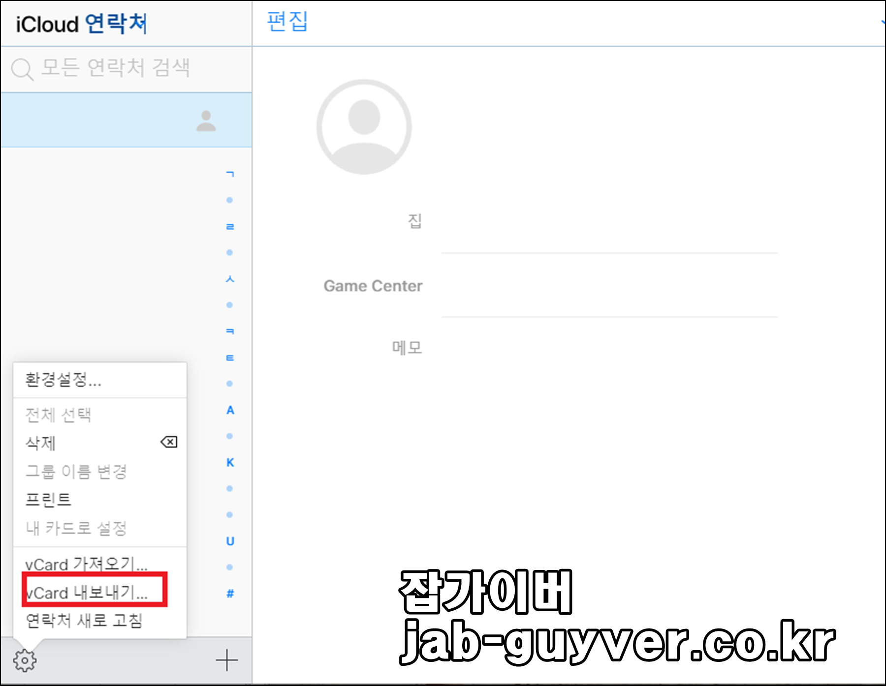 아이클라우드에 저장된 연락처를 내보내기 위해서는 vCard 내보내기를 선택합니다.