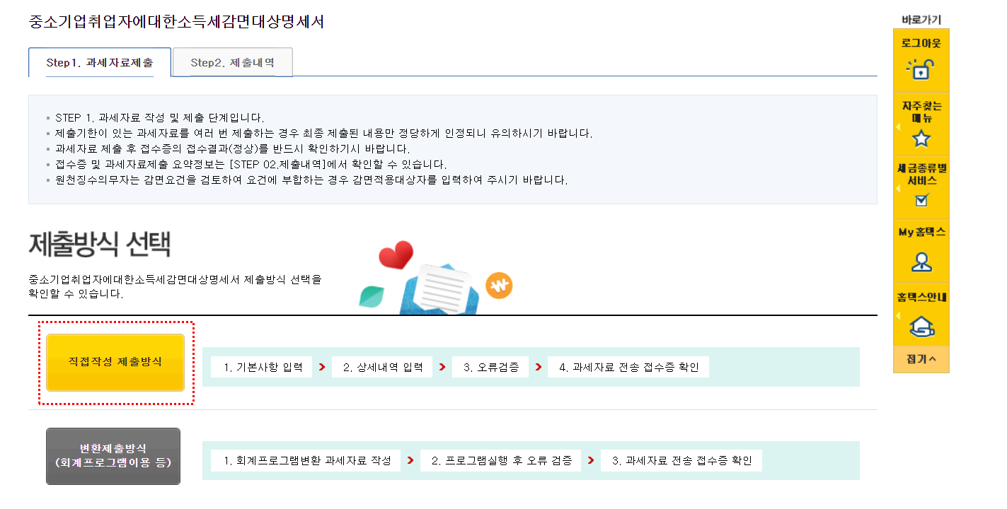 신청 / 제출 -> 과세자료 제출 -> 중소기업취업자에 대한 소득세감면 명세서