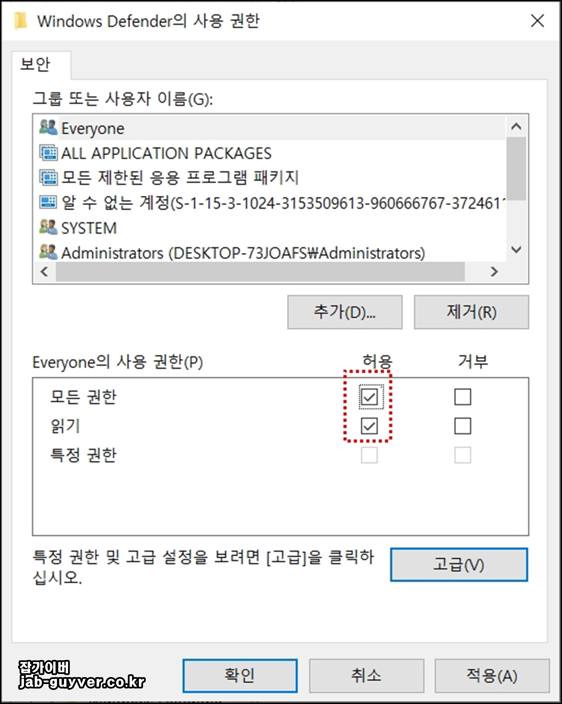 이후 해당 관리자권한에 대한 모든권한을 허용하도록 하는것으로 윈도우디펜더 기능에 대한 권한부여가 완료됩니다.