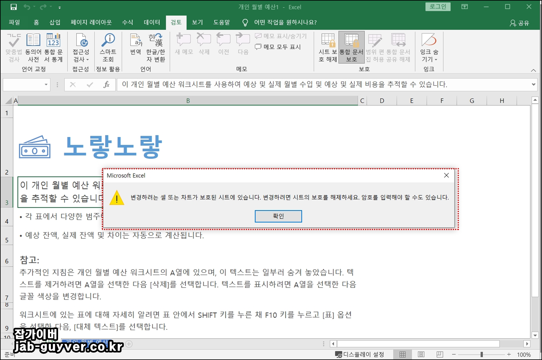 보호된 시트에서 수정을 시도하면 아래와 같은 메시지가 나타납니다.