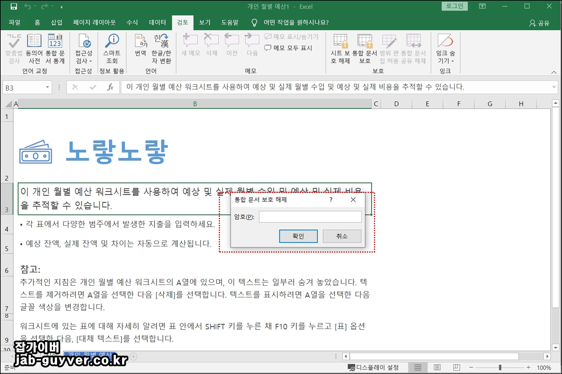 이때는 검토 > 시트 보호 해제를 눌러 앞에서 지정한 암호를 입력하고, 필요한 수정을 마친 뒤 다시 시트 보호를 켜주면 됩니다.