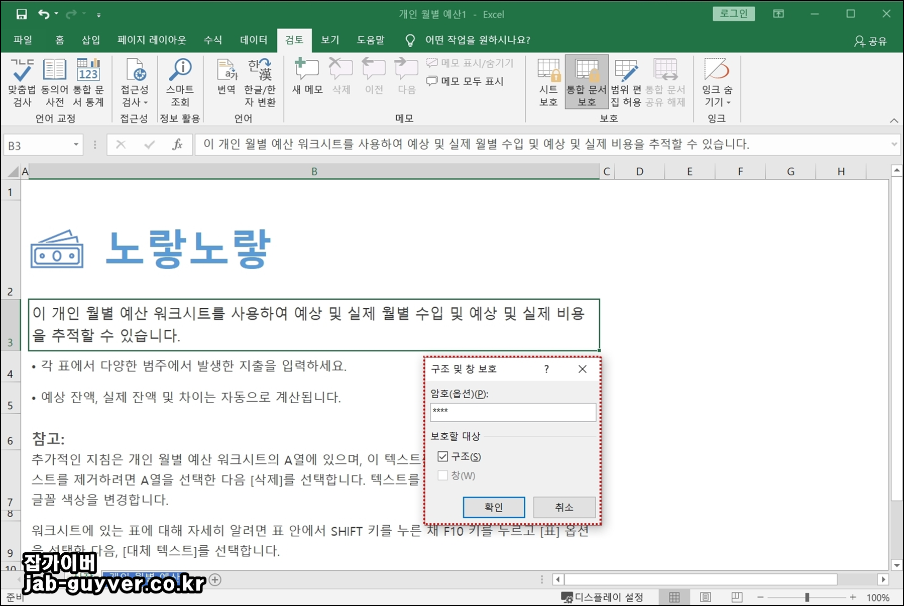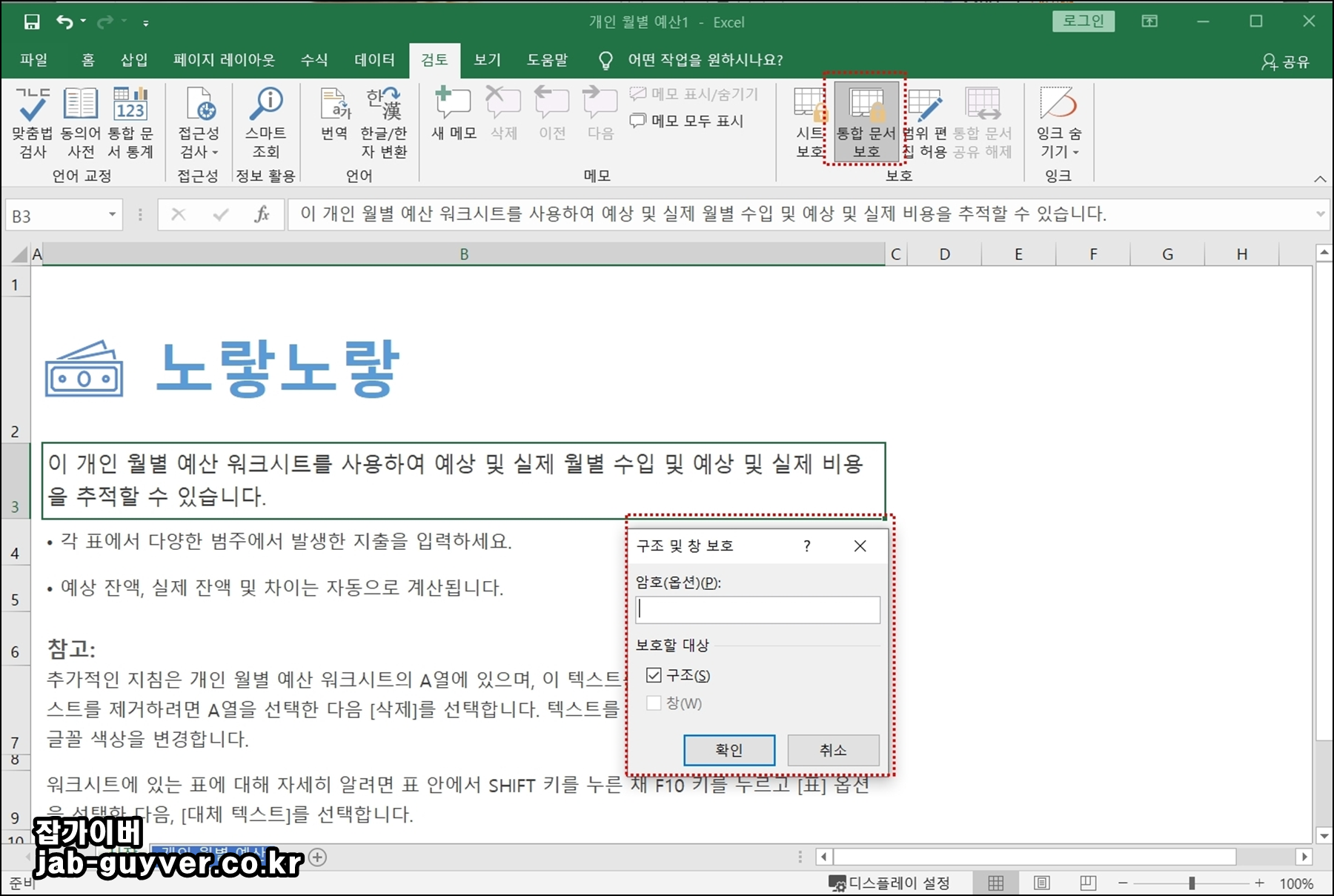 통합문서 전체의 구조를 먼저 잡고 싶다면, 검토 > 통합문서 보호를 눌러 암호를 지정합니다. 이때 보통 구조에 체크하고 암호를 입력하면, 이후에는 시트 추가·삭제·이동·숨기기가 마음대로 되지 않습니다.