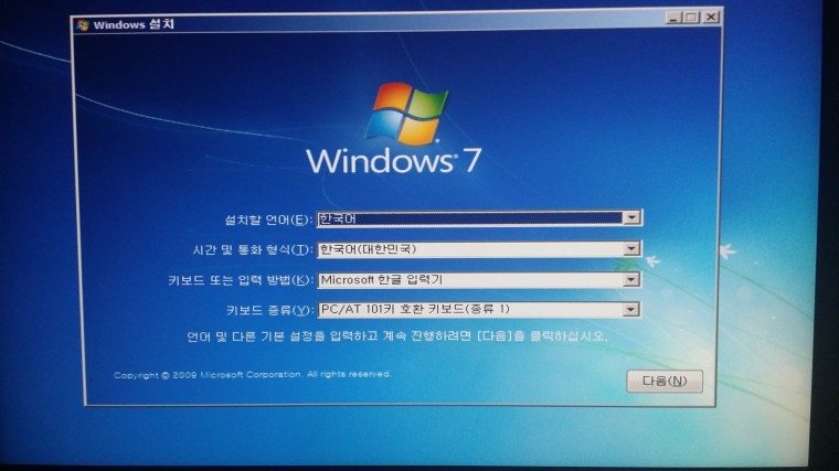 USB 부팅디스크로 부팅이 성공하면 가장 먼저 보게 되는 건 윈도우7 설치 화면입니다.