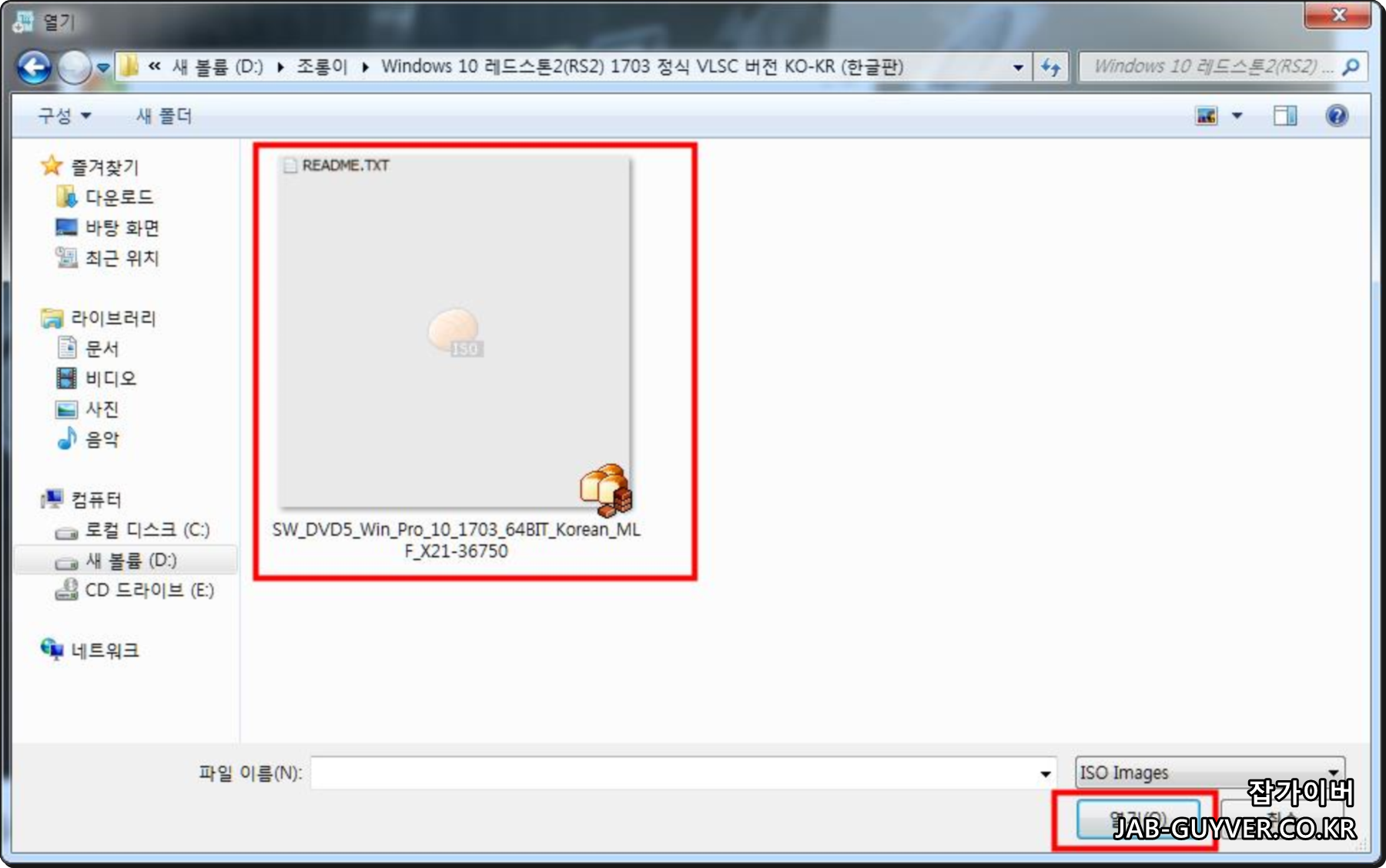 설치할 윈도우7.iso 파일을 선택하기 위해 Broses를 클릭 후 준비한 윈도우7 설치 파일을 선택해서 열기를 누릅니다.