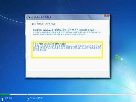 윈도우7 설치는 반드시 ‘사용자 지정(고급)’ 옵션을 선택해야 새로운 설치나 포맷이 가능합니다.