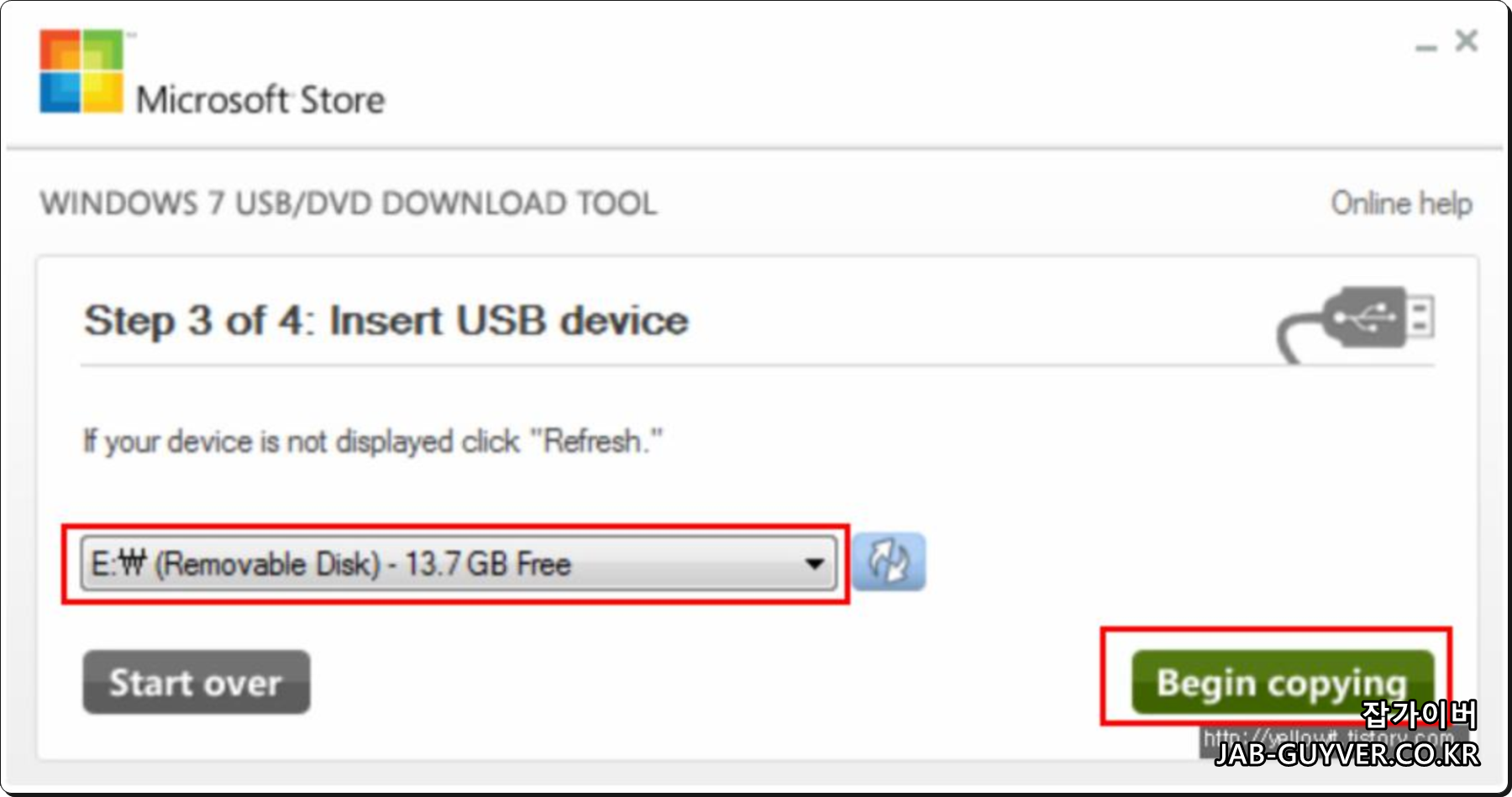 원하는 USB 드라이브를 선택 후 왼쪽의 Begin Copying 버튼을 눌러 부팅디스크를 복사합니다.