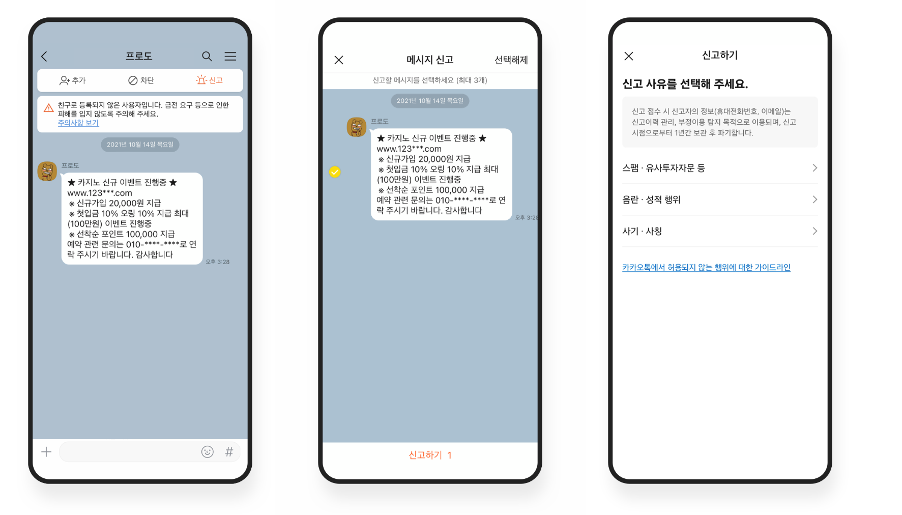 카카오톡 안녕가이드도 다수 신고 누적 시 메시지 전송이나 오픈채팅 이용이 제한될 수 있다고 밝히고 있고, 자동 감지 시스템이 비정상 패턴을 잡으면 보호조치가 먼저 들어갈 수 있다고 설명합니다.