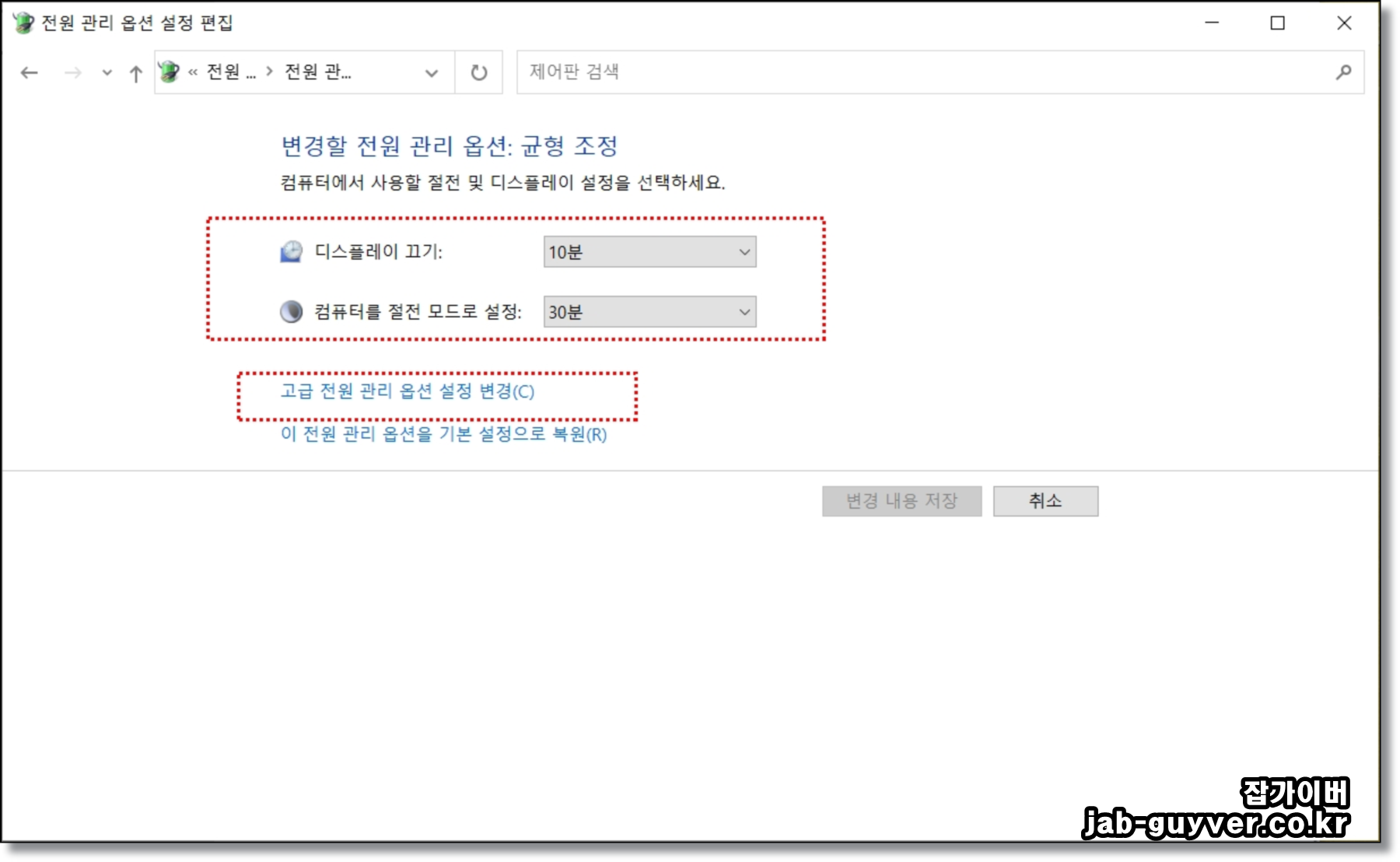 설정변경을 통해 디스플레이 끄기와 컴퓨터 절전모드 설정 및 고급설정을 진행합니다.