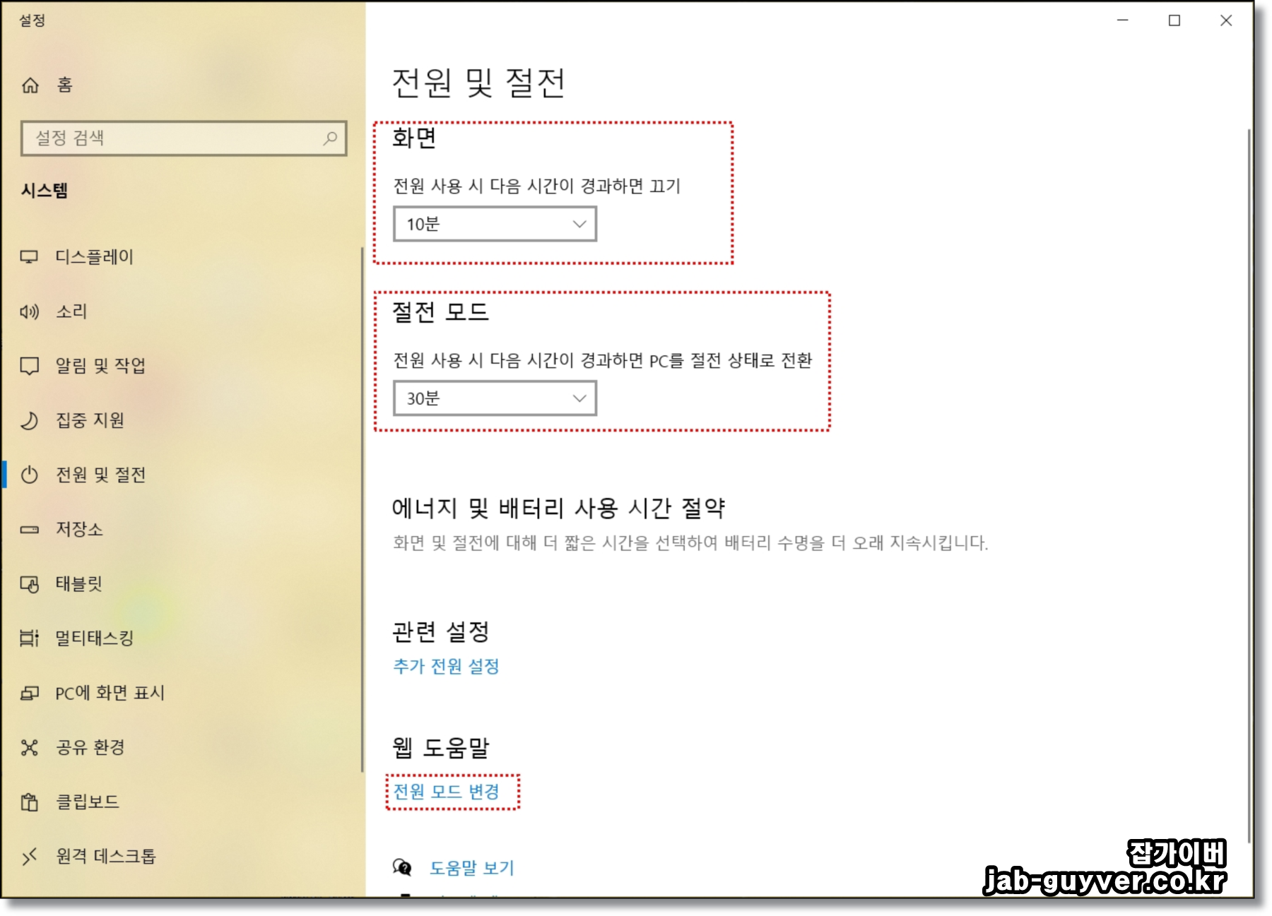 만약 절전모드 계속 나타나지 않는다면 위 내용을 참고해서 절전모드 활성화합니다.