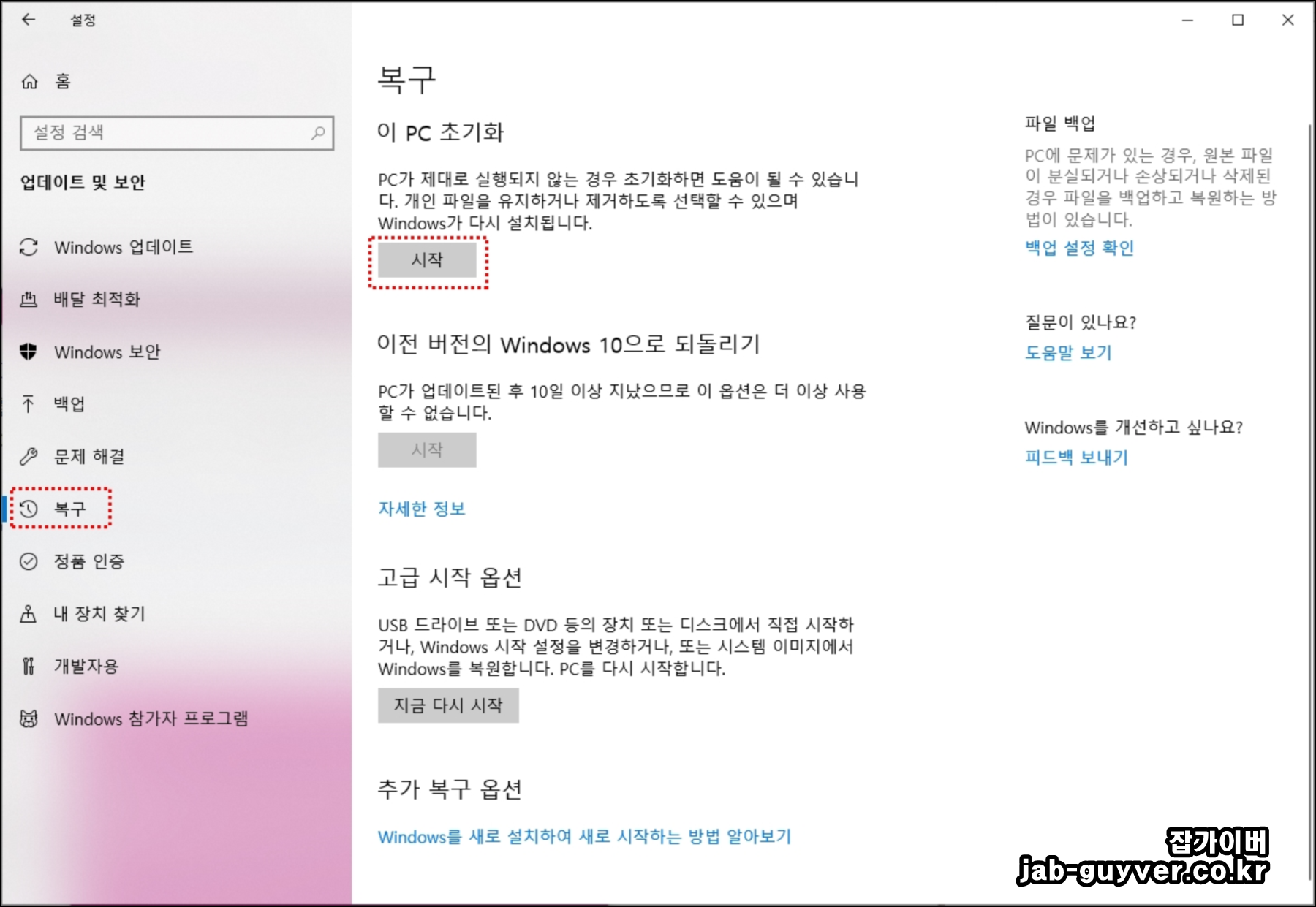 위 방법 외에도 윈도우가 설치되어 있다면 윈도우10에서 제공하는 초기화기능을 사용해서 복구가 가능합니다.