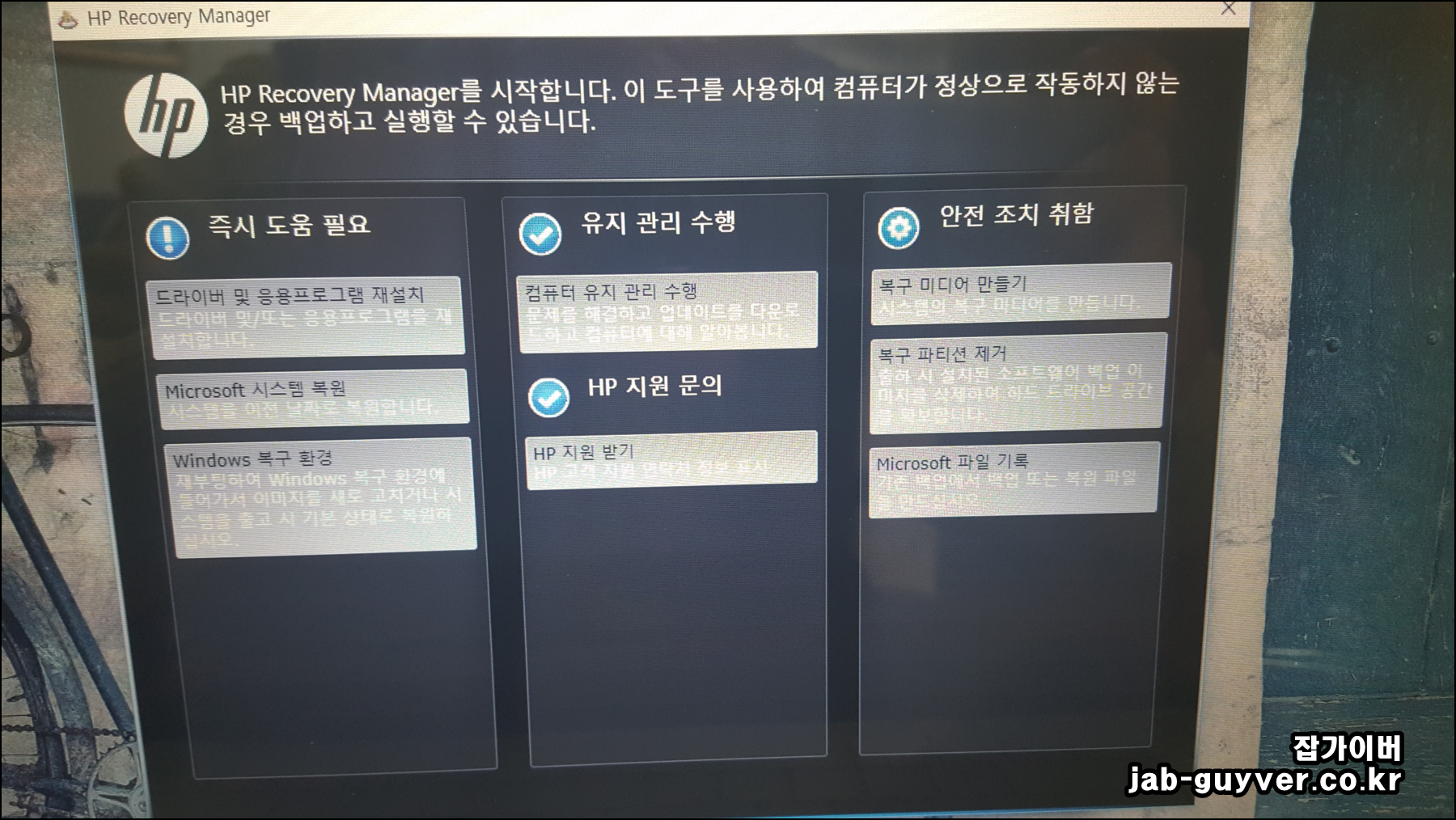 HP 노트북 기준으로 리커버리 매니저먼트가 실행되었으며 각각의 서포트를 받을 수 있으며 업데이트 및 백업도 가능합니다.