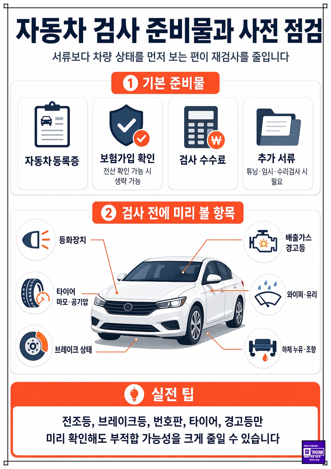 핵심은 보험이 유효해야 한다는 점입니다. 검사 당일 책임보험이 끊겨 있으면 바로 꼬일 수 있으니, 보험 만기일이 가까운 차량은 이 부분부터 먼저 보고 가는 편이 좋습니다.