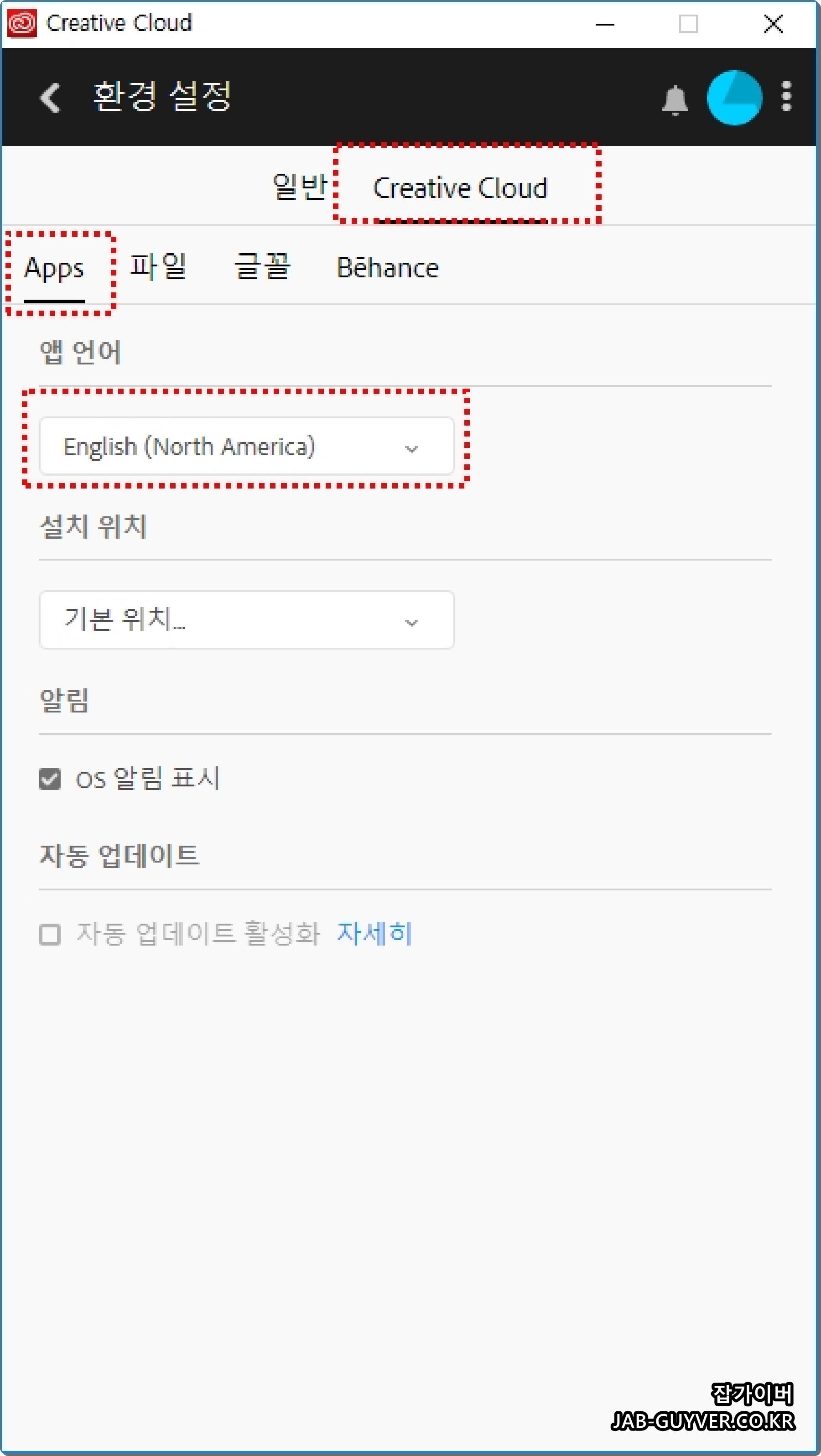 Creative Cloud -> App 이동 후 앱 언어를 English - 한국어로 변경합니다.