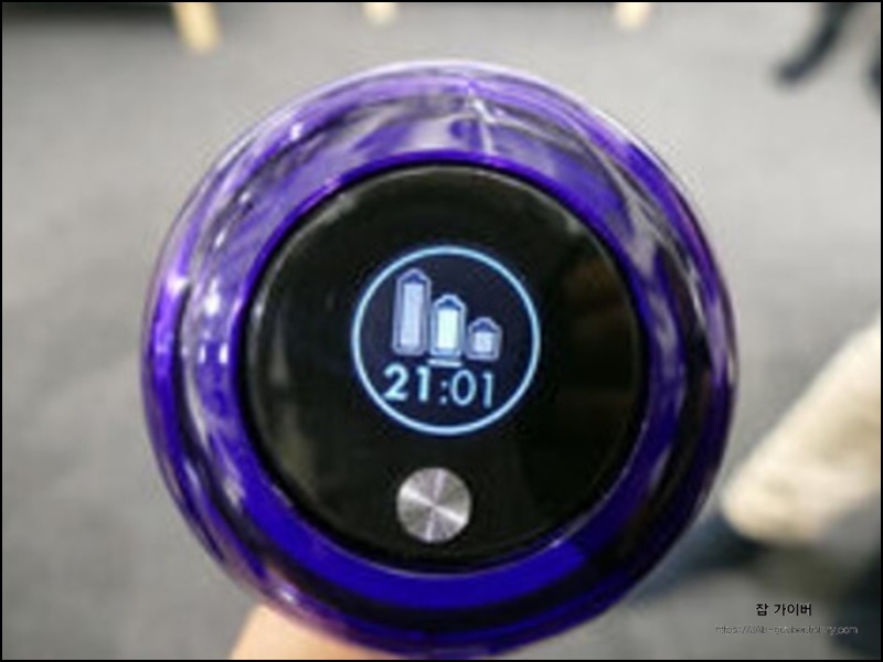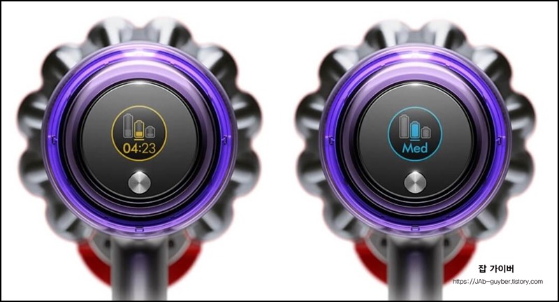 다이슨 V11 토크 드라이브 모델의 경우 디스플레이로 하여금 배터리 잔량과 함께 바닥의 종류와 필터 교환 시기 등 다양한 정보를 제공합니다.