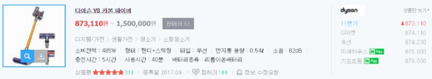 네이버에서 다이슨 V8의 최저가를 찾아봤습니다